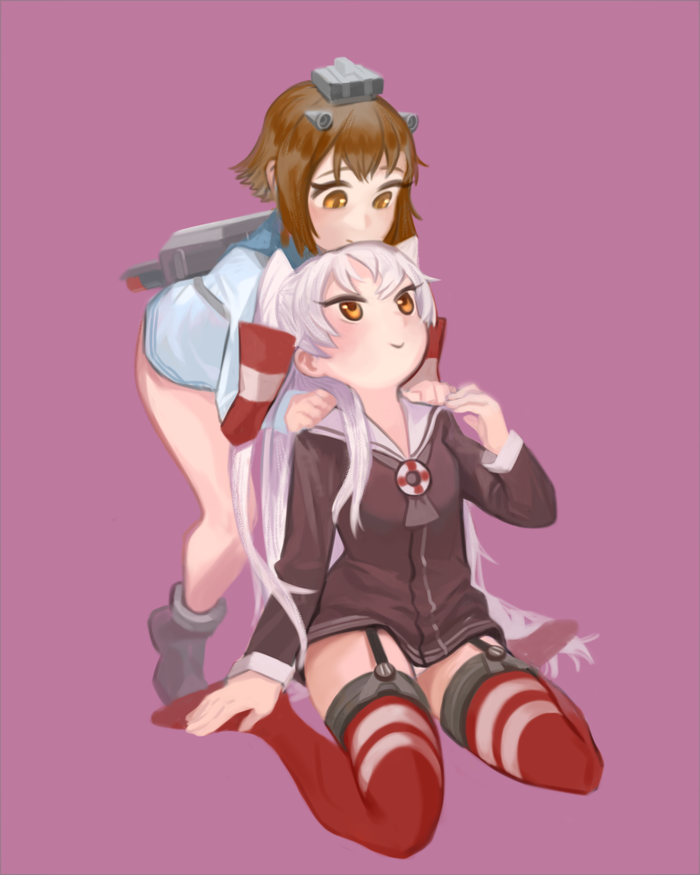2girls amatsukaze_(kancolle) black_dress blue_sailor_collar blush boots brown_eyes brown_hair commentary dress garter_straps gom_(kooskoo) hair_tubes hands_on_another's_shoulders headgear kantai_collection leaning_forward long_hair long_sleeves multiple_girls orange_eyes purple_background red_boots sailor_collar sailor_dress short_dress short_hair simple_background sitting standing thigh_boots thighhighs two_side_up white_dress white_hair white_sailor_collar yukikaze_(kancolle)