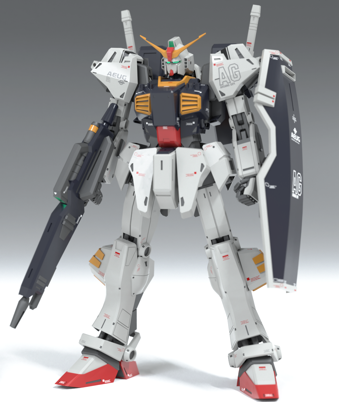 3d aeug beam_rifle commentary_request energy_gun gassan_(7nan8ku) gradient_background gundam gundam_mk_ii highres machinery mecha mecha_focus mobile_suit no_humans original realistic redesign robot science_fiction shield v-fin weapon zeta_gundam