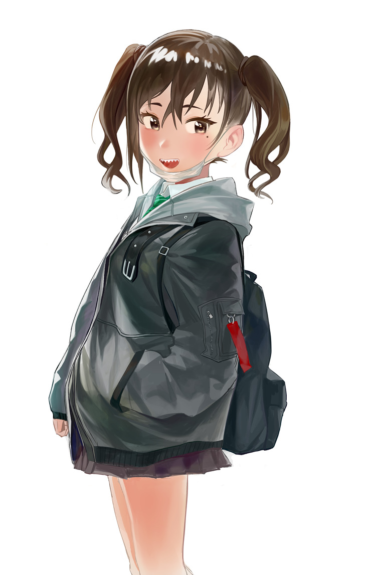 1girl backpack bag blush brown_eyes brown_hair commentary gom_(kooskoo) hair_between_eyes hand_in_pocket hood hood_down idolmaster idolmaster_cinderella_girls long_sleeves mask mask_pull mixed-language_commentary mole mole_under_eye mouth_mask open_mouth sharp_teeth shirt simple_background solo sunazuka_akira teeth twintails white_background white_mask white_shirt