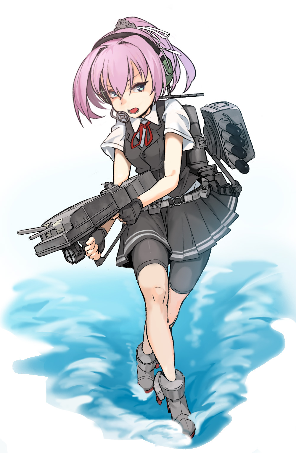 1girl bike_shorts bike_shorts_under_skirt black_gloves black_skirt black_vest blue_eyes collared_shirt commentary_request fingerless_gloves gloves gom_(kooskoo) hair_ribbon headphones headset highres holding kantai_collection neck_ribbon open_mouth pink_hair pleated_skirt ponytail red_ribbon ribbon rigging rudder_footwear shiranui_(kancolle) shirt short_sleeves shorts shorts_under_skirt simple_background skirt solo vest water white_background white_ribbon white_shirt