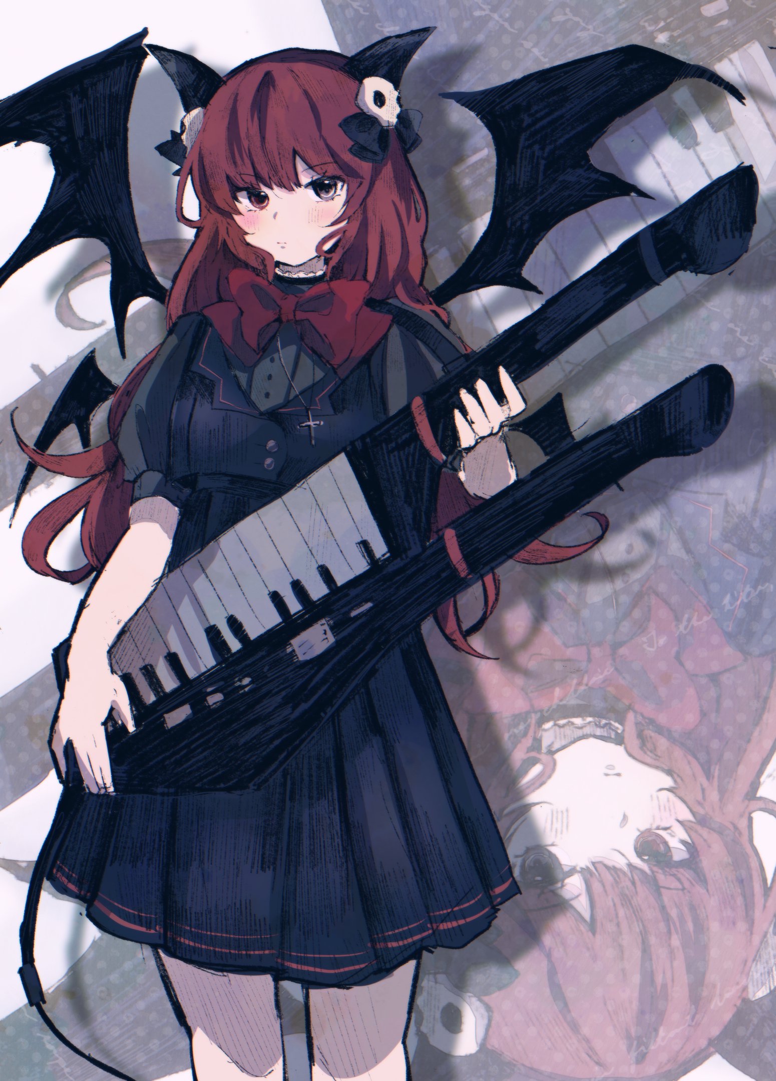 1girl bat_wings black_dress black_ribbon buttons cross cross_necklace demon_horns dress hair_ornament hair_ribbon heterochromia highres horns instrument jewelry keytar long_hair necklace nyanyamo_daowa puffy_short_sleeves puffy_sleeves red_hair red_ribbon ribbon short_sleeves skull_hair_ornament towelket_wo_mou_ichido wings yorumorukimiri yukikaze2828