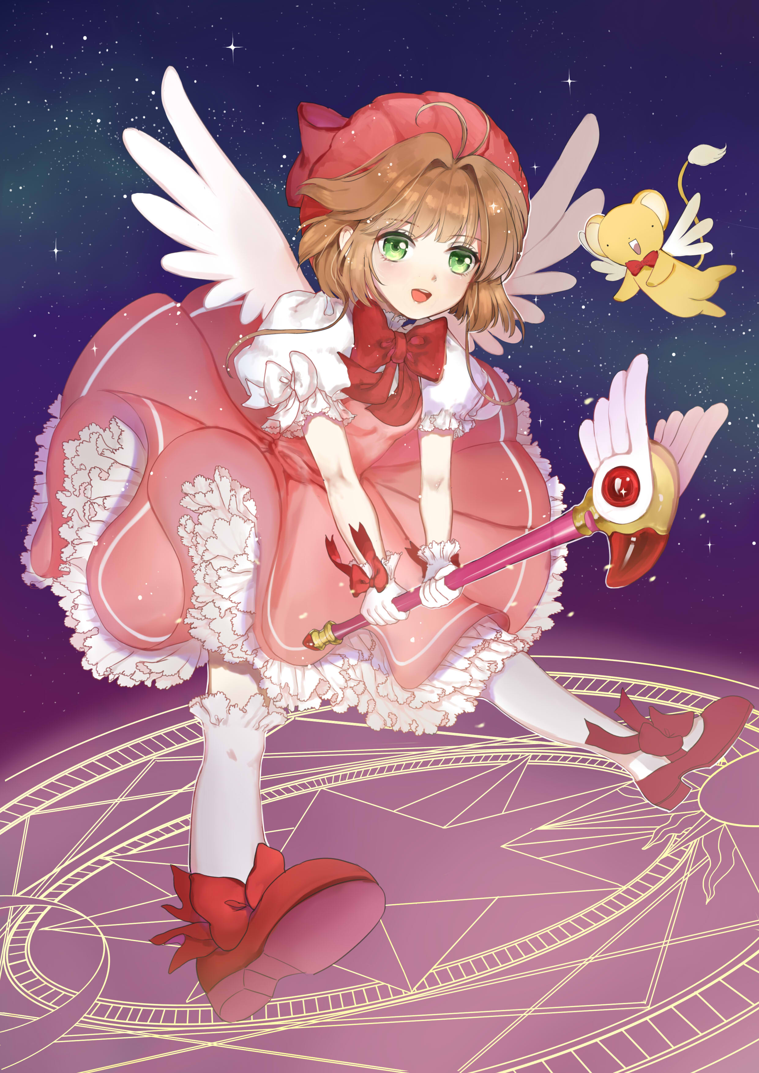 1girl absurdres an876-com angel_wings antenna_hair beret bow bowtie brown_hair cardcaptor_sakura circle_skirt commentary dress eyelashes ferret floating_clothes footwear_bow frilled_gloves frilled_socks frills full_body gloves green_eyes hair_intakes hat hat_bow highres holding holding_wand kero_(cardcaptor_sakura) kinomoto_sakura kinomoto_sakura_(magician) kneehighs leaning_forward light_blush light_particles looking_at_viewer magic_circle magical_girl mary_janes medium_dress open_mouth petticoat pinafore_dress pink_dress pleated_dress puffy_short_sleeves puffy_sleeves red_bow red_bowtie red_hat red_shoes shirt shoes short_hair short_sleeves sleeveless sleeveless_dress smile socks space sparkle standing teeth traditional_bowtie upper_teeth_only wand white_gloves white_shirt white_socks white_wings winged_animal wings wrist_bow