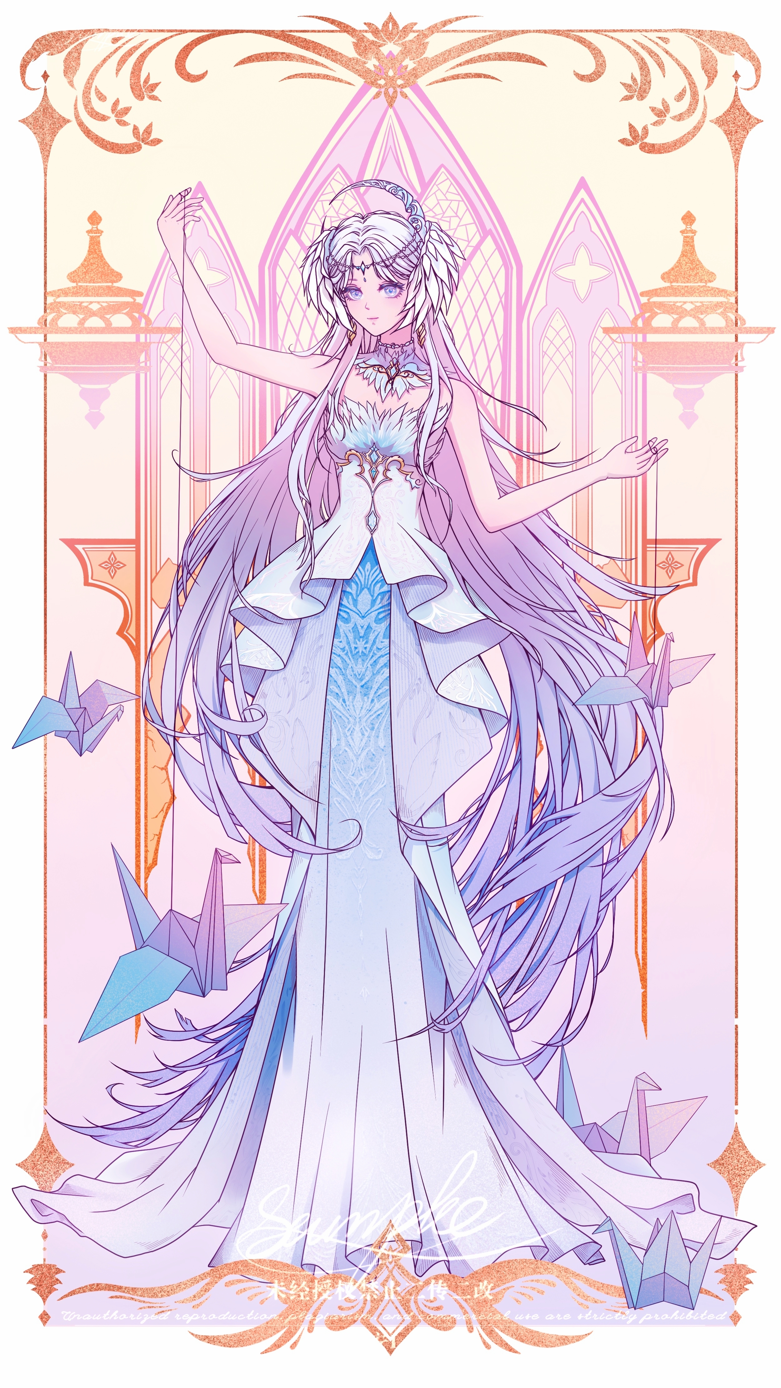 1girl absurdres arm_up bare_arms bare_shoulders black_bow blue_collar blue_dress border bow chinese_commentary circlet closed_mouth collar commentary_request detached_collar dress eyelashes feather_hair_ornament feathers floating floating_object full_body gown gradient_background gradient_clothes gradient_dress gradient_hair grey_eyes grey_hair hair_ornament halo halo_behind_head highres infinity_nikki jewelry lipstick long_hair looking_at_viewer makeup multicolored_hair necklace nikki_(series) origami outstretched_arms paper_crane parted_bangs picture_frame pink_background pink_lips purple_hair sample_watermark silvergale's_aria_(infinity_nikki) smile solo standing strapless strapless_dress string_around_finger very_long_hair watermark white_border white_dress yellow_background yian6881