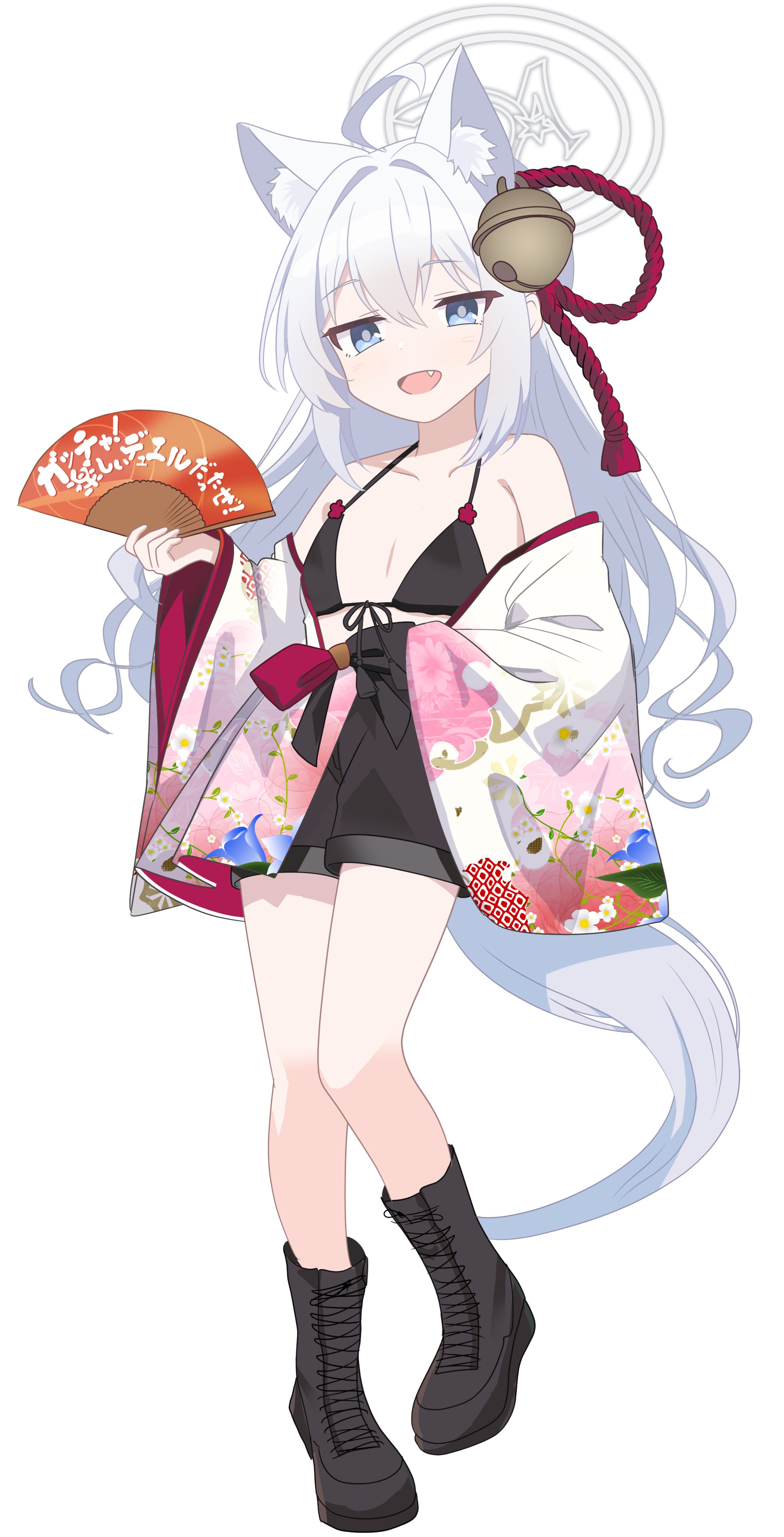 1girl absurdres ahoge animal_ear_fluff animal_ears aventador bell bikini black_bikini black_shorts blue_archive blue_eyes boots breasts fang folding_fan fox_ears fox_girl fox_tail full_body hair_bell hair_ornament hakama halo hand_fan highres holding holding_fan japanese_clothes jingle_bell kimono long_hair long_sleeves looking_at_viewer open_clothes open_mouth original shorts sian-chan simple_background skin_fang skirt small_breasts smile solo swimsuit tail white_background white_hair wide_sleeves