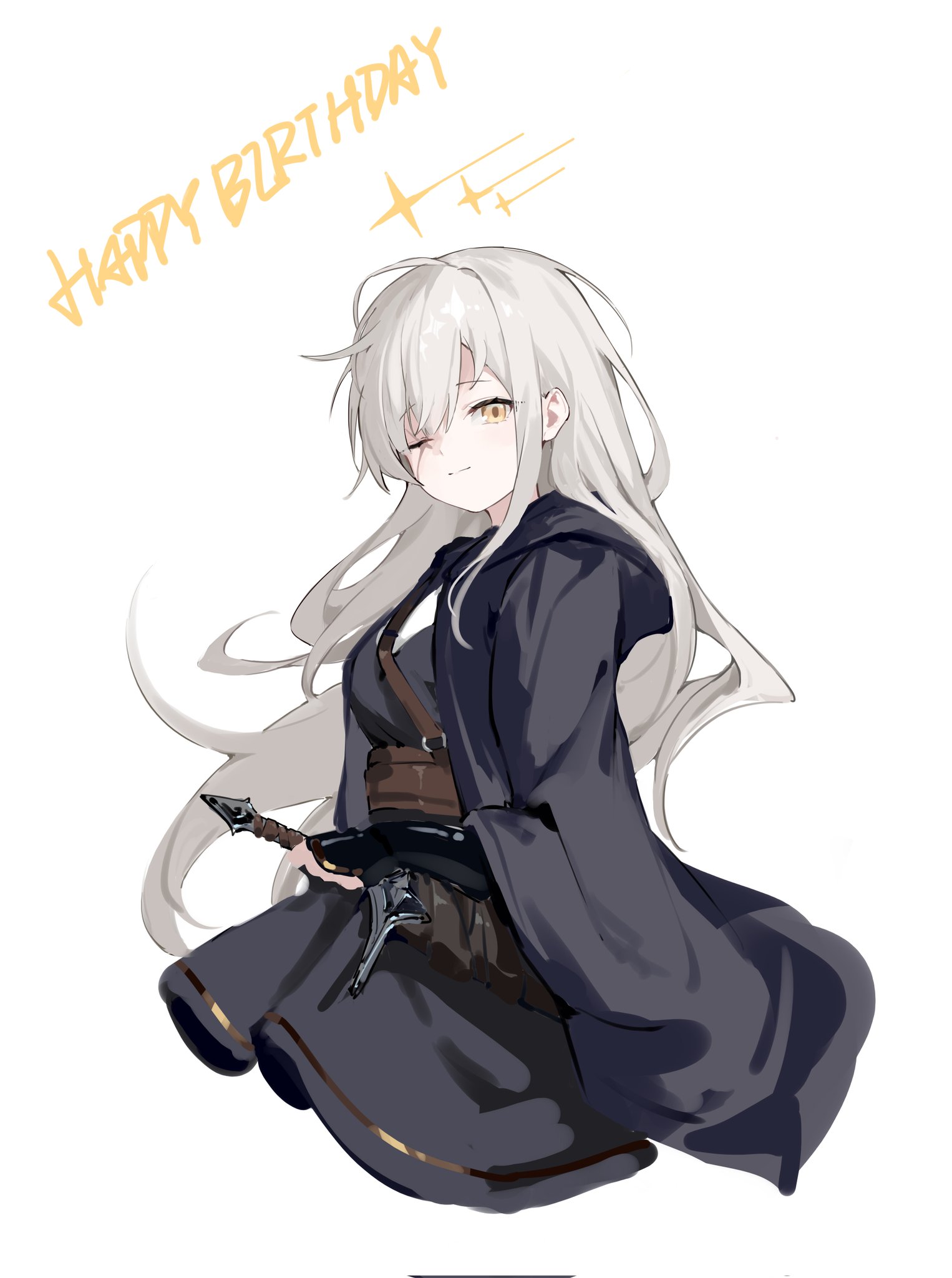 black_robe black_skirt english_text grey_hair hair_between_eyes highres holding holding_sword holding_weapon long_hair looking_at_viewer nariku one_eye_closed original robe scar scar_across_eye scar_on_face shirt simple_background skirt sword weapon white_shirt yellow_eyes