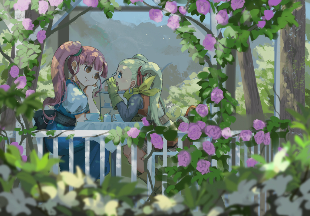 2girls blonde_hair blue_dress blue_eyes blunt_bangs blurry branch bright_pupils brown_eyes commentary_request cup dappled_sunlight depth_of_field dragon_quest dragon_quest_builders_2 dress earrings female_builder_(dqb2) flower garden gloves hair_pulled_back hair_ribbon hand_on_own_chin hoop_earrings jewelry leaf looking_at_another matsuge_(gajigaji) multiple_girls neckerchief open_mouth outdoors pink_flower pink_hair pink_rose profile puffy_short_sleeves puffy_sleeves red_ribbon ribbon rose ruru_(dqb2) shirt_under_dress short_sleeves side_ponytail silver_earrings sitting sunlight tablecloth teacup tiered_tray tree white_fence white_pupils yellow_gloves yellow_neckerchief