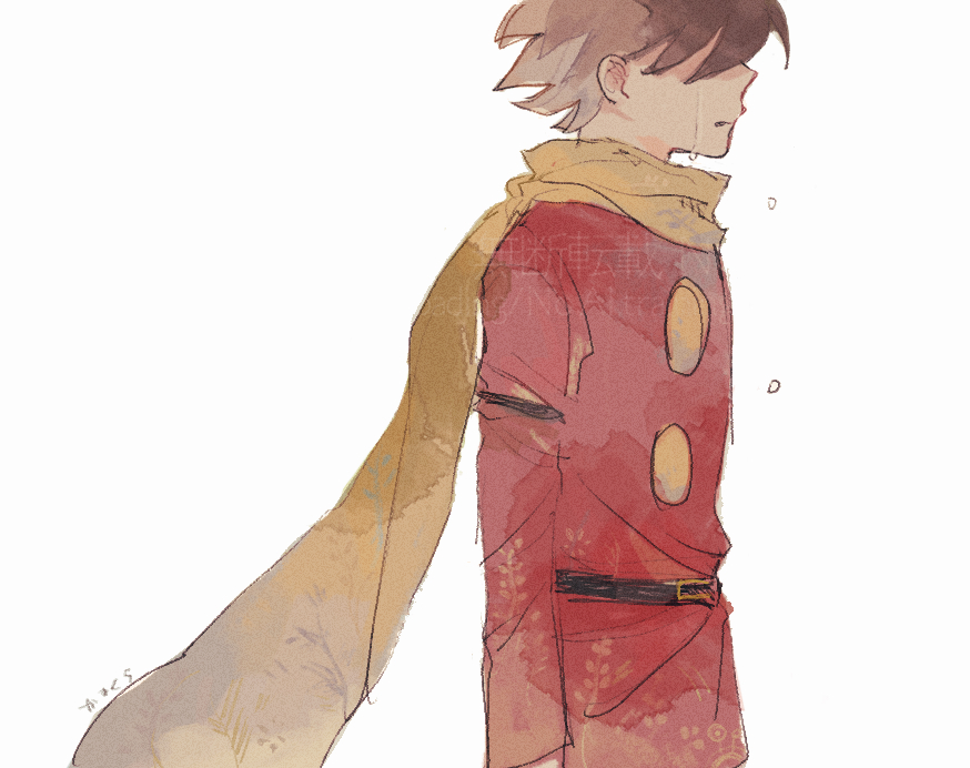 1boy belt black_boots boots brown_hair buttons coat crying cyborg cyborg_009 hair_between_eyes hair_over_eyes kmkr_umi military_uniform red_coat scarf shimamura_joe short_hair soldier spiked_hair streaming_tears tears upper_body yellow_scarf