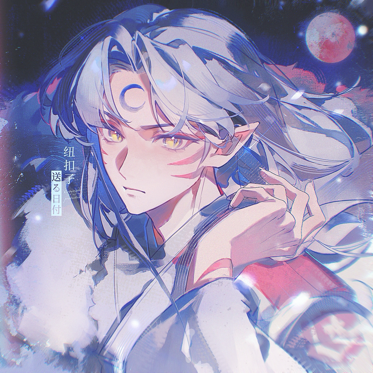 1boy closed_mouth crescent crescent_facial_mark facial_mark forehead_mark highres inuyasha japanese_clothes long_hair looking_at_viewer male_focus niukou_kouzi pointy_ears sesshoumaru solo white_hair yellow_eyes