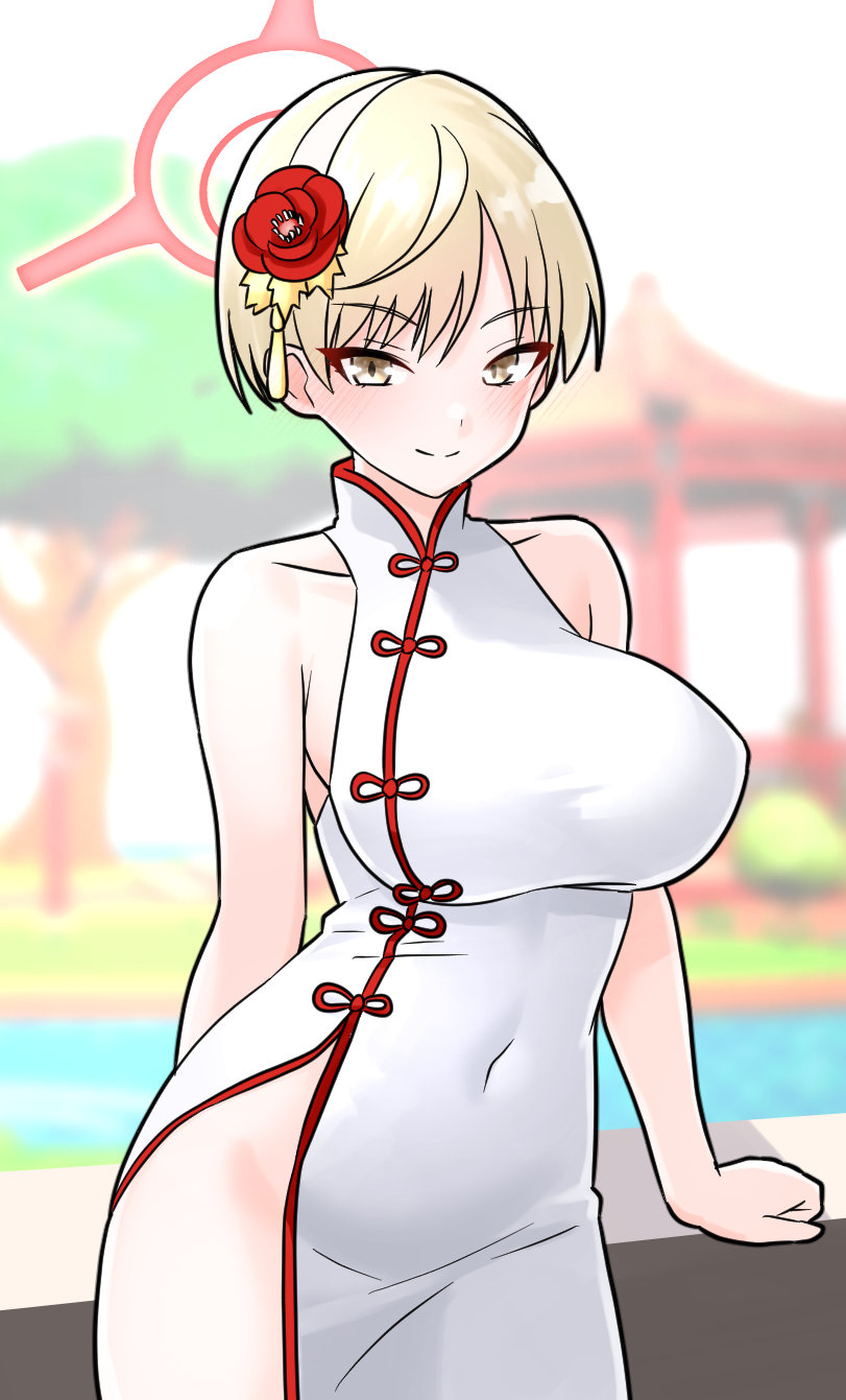 bare_shoulders blonde_hair blue_archive breasts china_dress chinese_clothes commentary_request dress flower furaggu_(frag_0416) hair_flower hair_ornament halo highres large_breasts looking_at_viewer marina_(blue_archive) marina_(qipao)_(blue_archive) official_alternate_costume outdoors red_halo short_hair sleeveless sleeveless_dress white_dress yellow_eyes