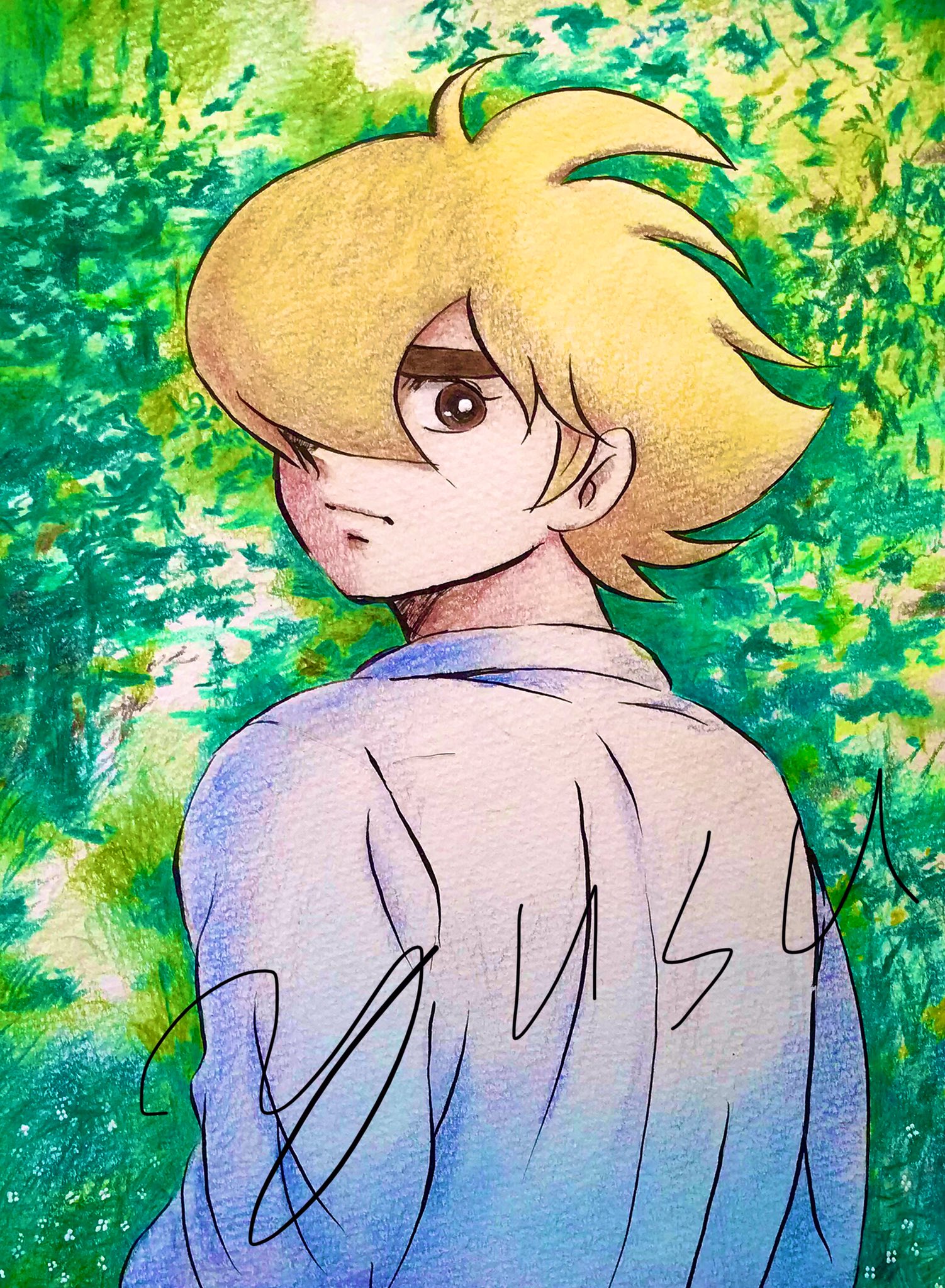0j_flz 1970s_(style) 1boy ahoge blonde_hair brown_eyes cyborg cyborg_009 forest hair_over_one_eye hands_in_pockets highres looking_at_viewer looking_back male_focus nature oldschool retro_artstyle shirt short_hair solo spiked_hair straight_hair upper_body white_shirt