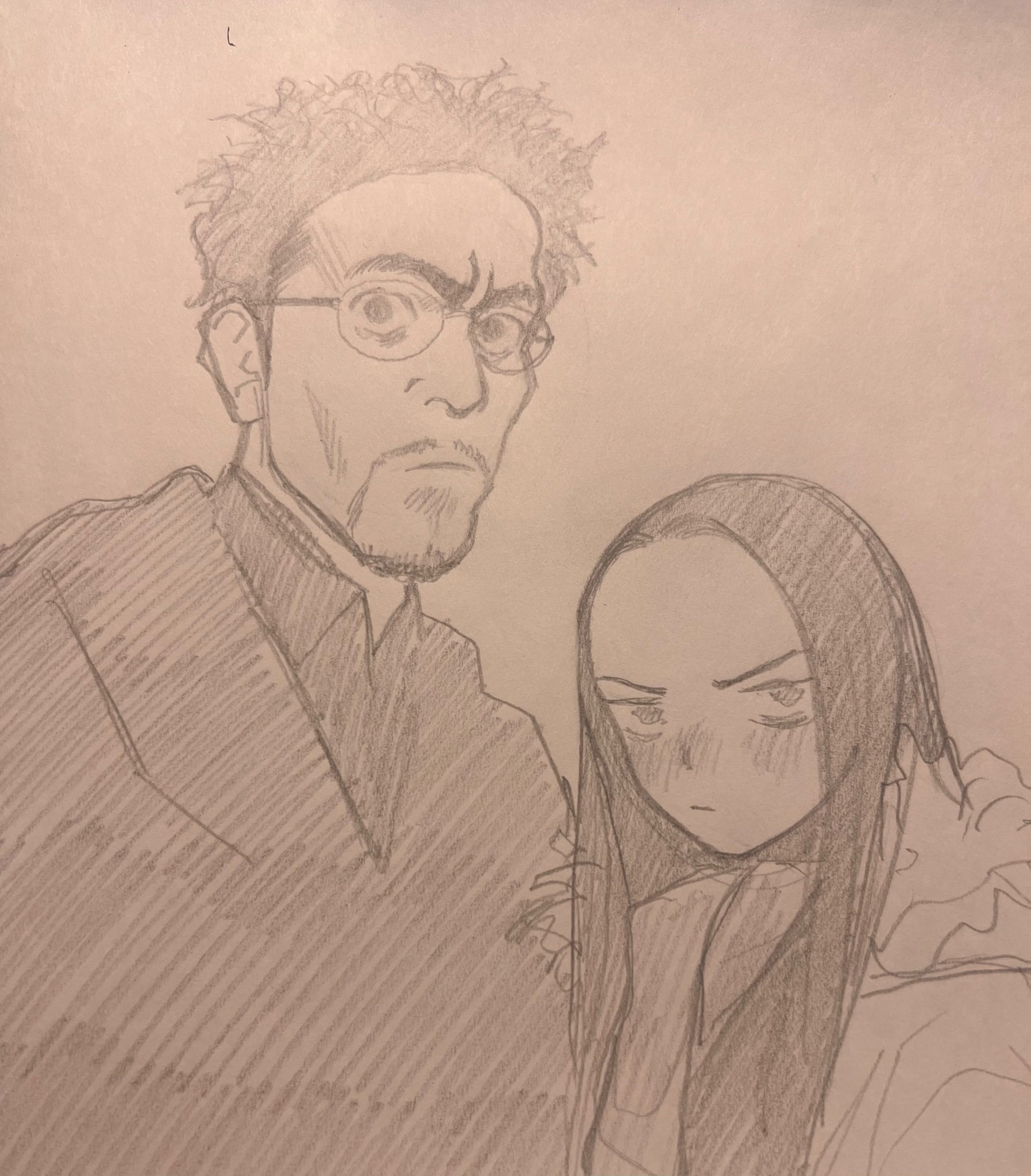 1boy 1girl beard coat facial_hair forehead glasses graphite_(medium) greyscale haguhagu_(rinjuu_circus) highres long_hair looking_at_viewer monochrome photo_(medium) simple_background sketch traditional_media trick_(tv_series) ueda_jirou upper_body yamada_naoko_(trick)
