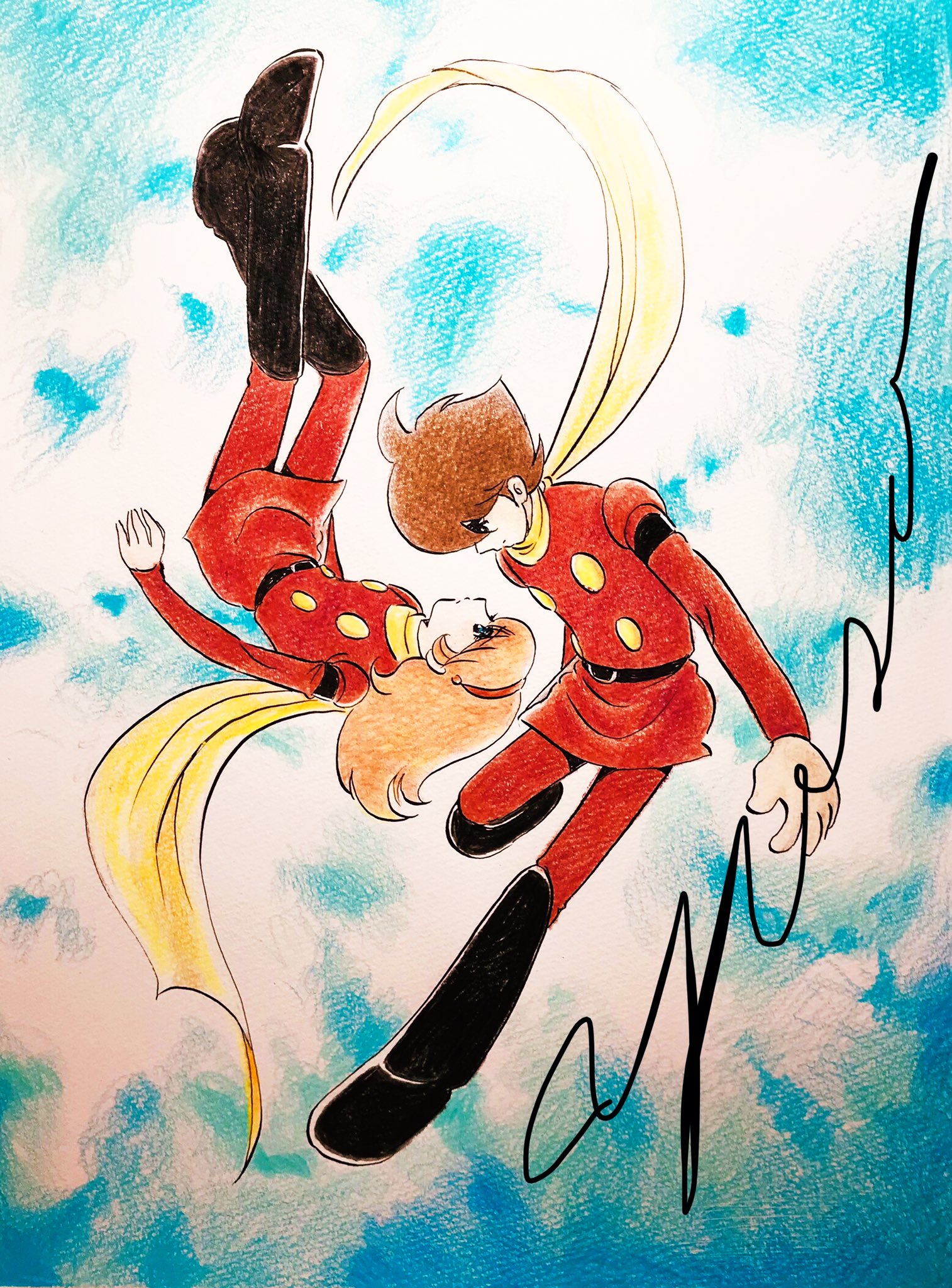 0j_flz 1boy 1girl ahoge belt black_boots blonde_hair blue_eyes boots brown_hair coat couple cyborg cyborg_009 francoise_arnoul hair_between_eyes highres long_hair looking_at_another red_coat scarf shimamura_joe short_hair yellow_scarf