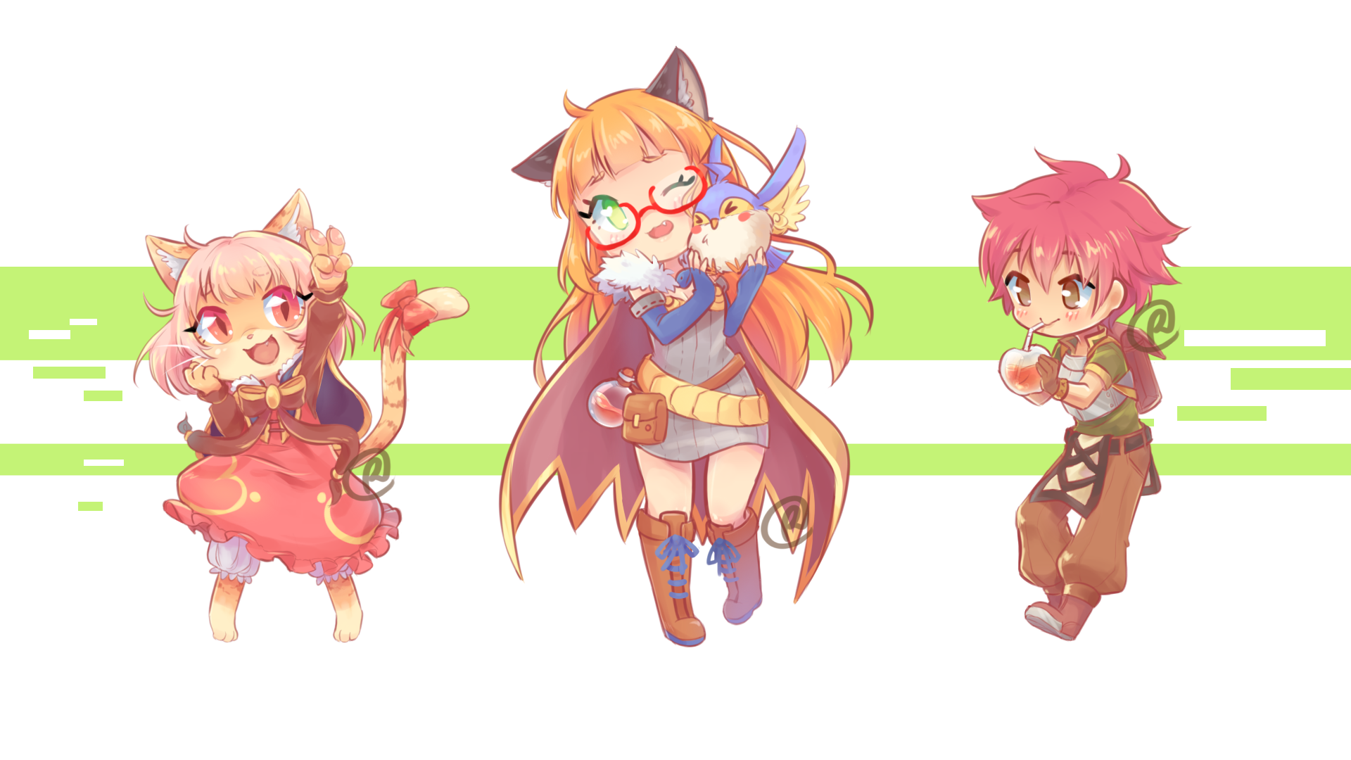 1boy 2girls alchemist_(ragnarok_online) animal animal_ears backpack bag bird blonde_hair bloomers blue_bird blue_gloves blunt_bangs boots bow brown_bag brown_boots brown_cape brown_eyes brown_pants cape capelet cat_ears cat_girl cat_tail chest_guard commentary dress elbow_gloves english_commentary filir_(ragnarok_online) fingerless_gloves full_body fur_collar furry furry_female glasses gloves green_eyes grey_dress highres holding holding_animal holding_bird long_hair multiple_girls novice_(ragnarok_online) open_mouth pants pink_bow pink_dress pink_hair purple_capelet ragnarok_online red-framed_eyewear short_hair short_sleeves standing summoner_(ragnarok_online) tail tail_bow tail_ornament underwear vyolfers white_bloomers