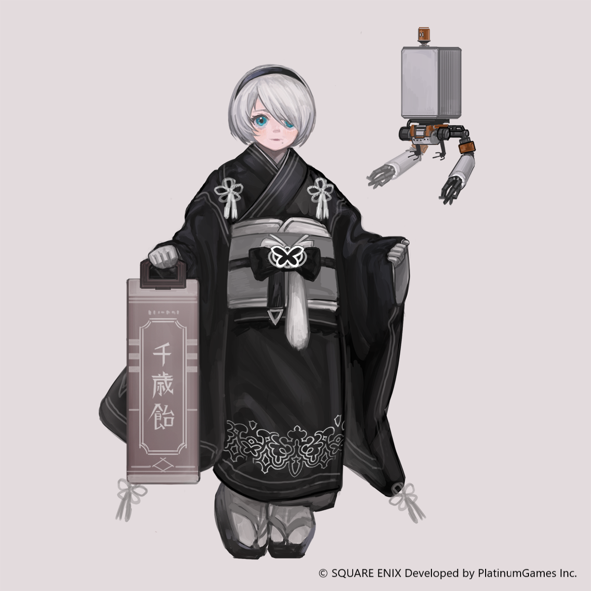 1girl 2b_(nier:automata) 2boys aged_down black_kimono blue_eyes child full_body gloves grey_hair hairband highres ishimaru_mai japanese_clothes kimono light_smile looking_at_viewer multiple_boys nier:automata nier_(series) official_art pod_(nier:automata) robot sandals short_hair solo tabi zouri