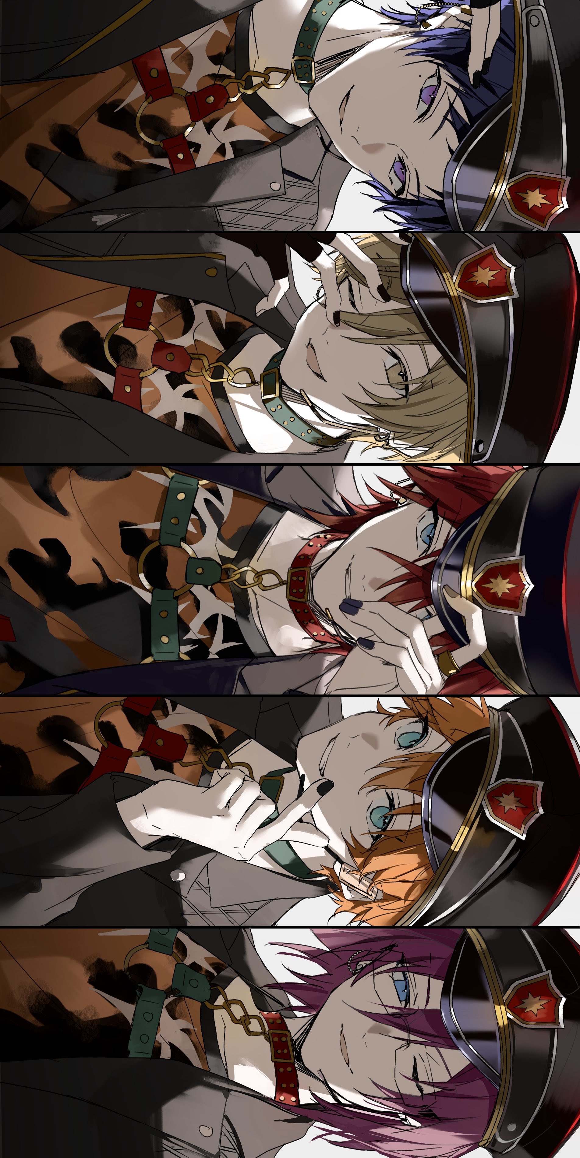 5boys absurdres akehoshi_subaru amagi_rinne belt_collar black_hat black_jacket black_nails blue_eyes blue_hair brown_eyes brown_hair choker collar ensemble_stars! finger_heart fushimi_yuzuru glasses hat highres holding holding_unworn_clothes holding_unworn_hat jacket looking_at_viewer mashiro_tomoya medium_hair mole mole_under_eye multiple_boys nozz177 official_alternate_costume one_eye_closed orange_hair parted_lips pink_hair purple_eyes red_choker red_hair saegusa_ibara short_hair sideways smile unworn_hat unworn_headwear