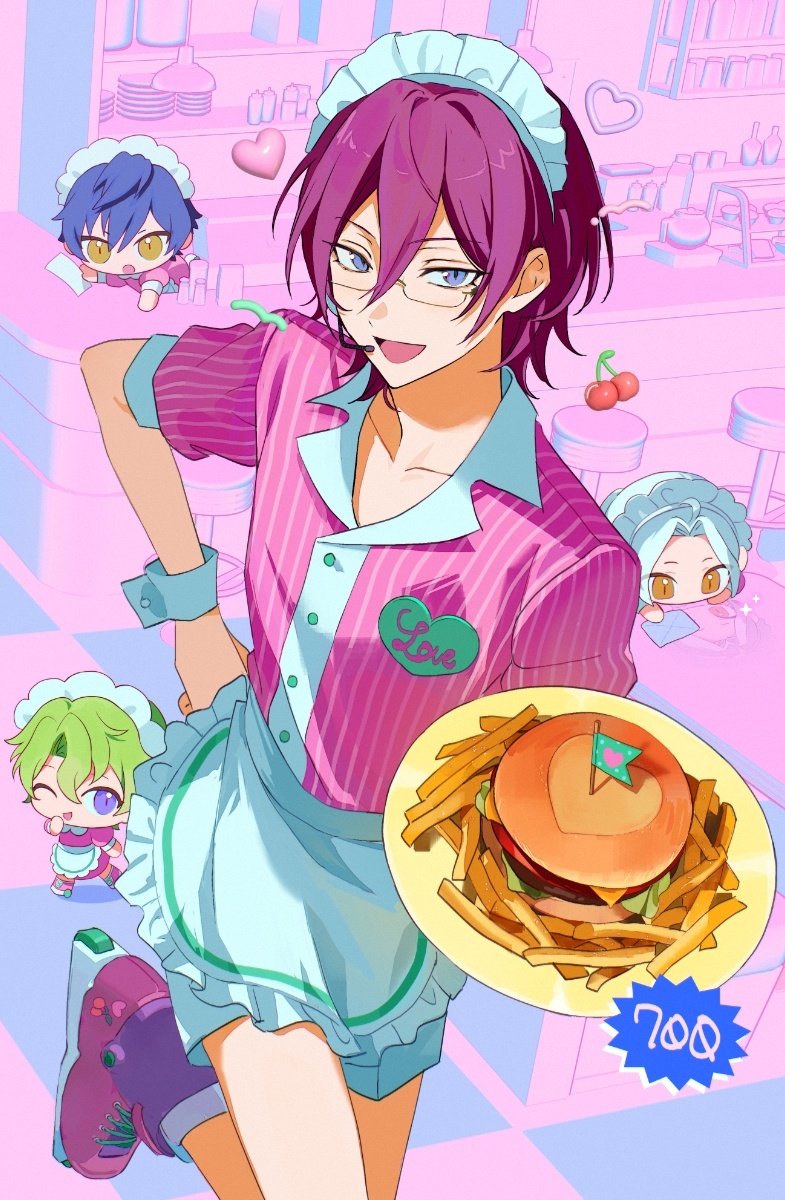 4boys apron blue_hair burger chibi ensemble_stars! food french_fries glasses green_hair hand_on_own_hip highres holding holding_plate maid_headdress medium_hair microphone multiple_boys one_eye_closed pink_hair pink_shirt pinstripe_pattern pinstripe_shirt plate purple_eyes ran_nagisa saegusa_ibara sarara_rarara sazanami_jun shirt short_hair short_sleeves standing standing_on_one_leg tomoe_hiyori waist_apron white_hair white_wrist_cuffs wrist_cuffs yellow_eyes
