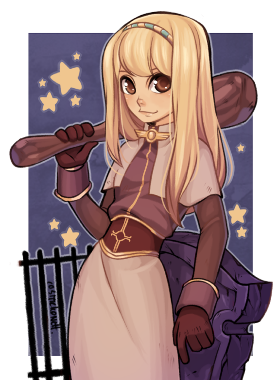 1girl acolyte_(ragnarok_online) blonde_hair brown_capelet brown_eyes brown_gloves brown_shirt brown_skirt capelet closed_mouth club_(weapon) commentary cowboy_shot english_commentary fence flat_chest gloves holding holding_club holding_weapon konett_(cosmickonett) long_hair long_sleeves looking_at_viewer ragnarok_online shirt skirt smile solo star_(symbol) tombstone weapon