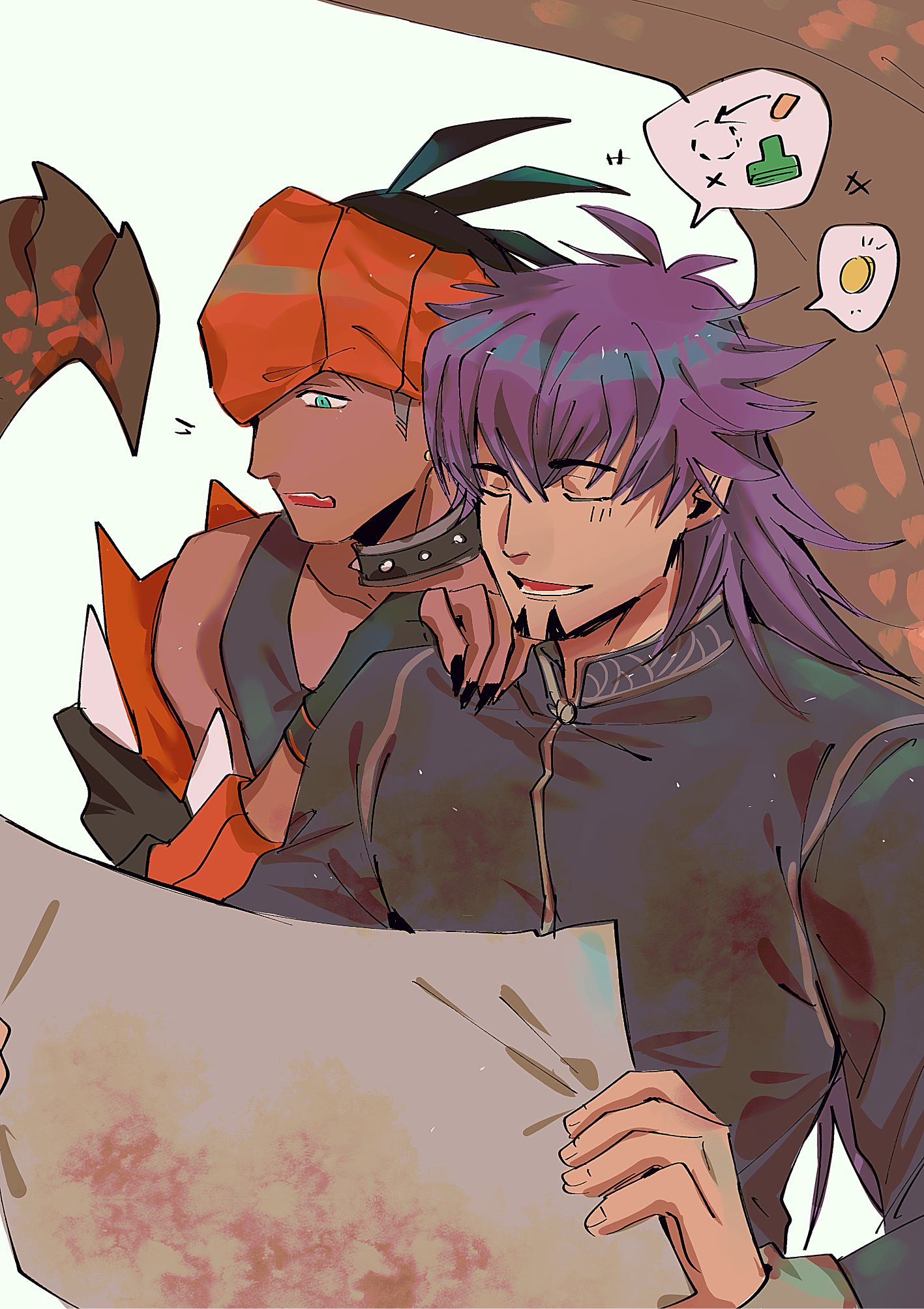 2boys black_hair black_nails black_shirt black_tank_top chiyo_(miichiyochin) closed_eyes commentary dark-skinned_male dark_skin dragon_boy dragon_wings earrings facial_hair goatee hand_on_another's_shoulder highres holding holding_map jewelry leon_(pokemon) male_focus map multiple_boys nintendo open_mouth pokemon pokemon_swsh purple_hair raihan_(pokemon) shirt sideburns speech_bubble spoken_money spoken_object studded_choker tank_top white_background wings