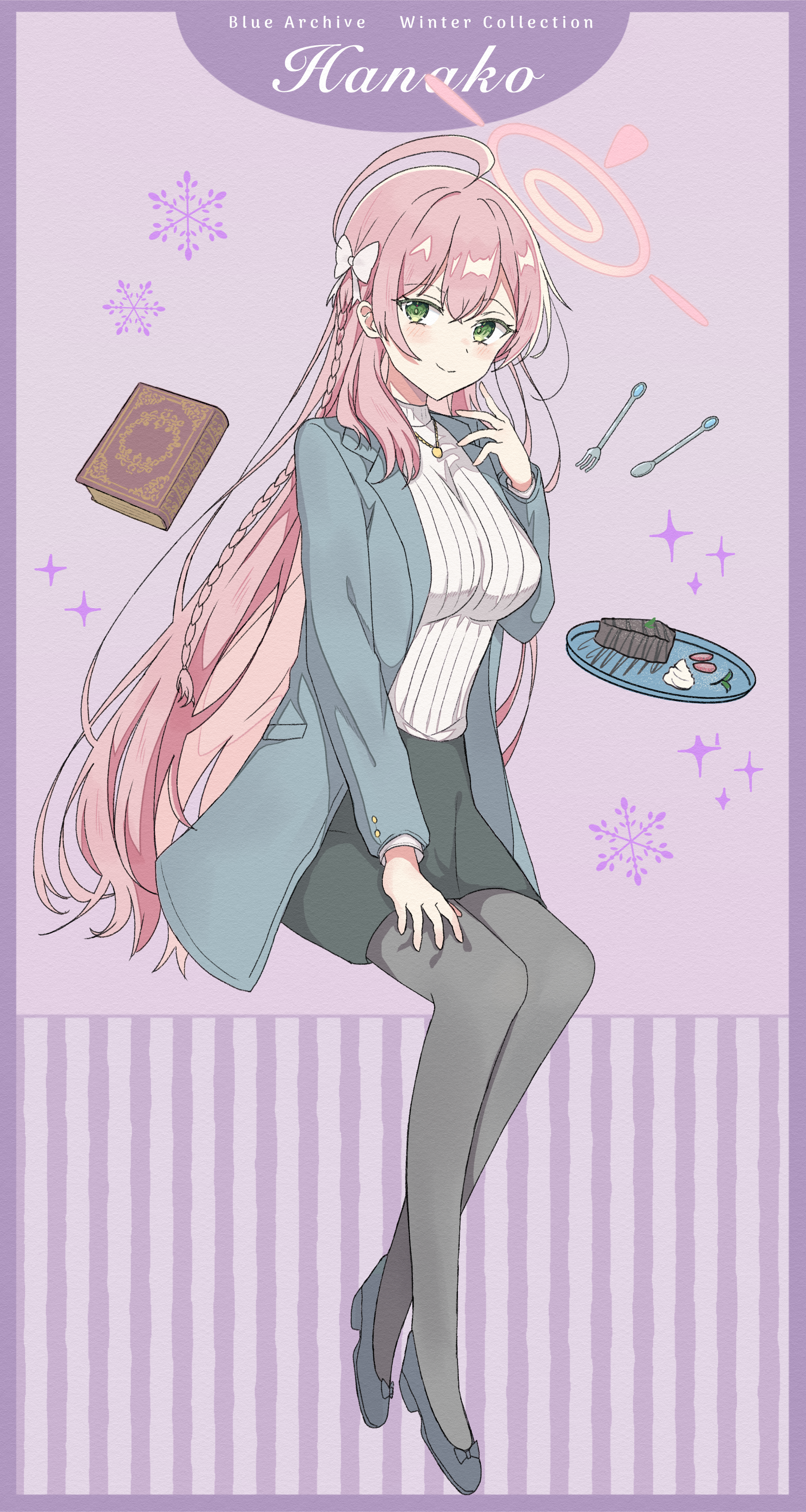 1girl absurdres ahoge alternate_costume black_shoes black_skirt blue_archive blue_jacket blush book border bow braid breasts bright_pupils cake cake_slice character_name closed_mouth commentary_request copyright_name english_text food fork full_body green_eyes grey_pantyhose hair_between_eyes hair_bow hair_over_shoulder halo hanako_(blue_archive) hand_on_own_thigh hand_up highres huge_ahoge invisible_chair jacket large_breasts long_hair looking_at_viewer nakochizu open_clothes open_jacket pantyhose pencil_skirt pink_hair pink_halo purple_background purple_border ribbed_sweater shoes simple_background single_braid sitting skirt smile snowflakes solo sparkle split_mouth spoon sweater turtleneck turtleneck_sweater very_long_hair white_bow white_sweater winter_clothes
