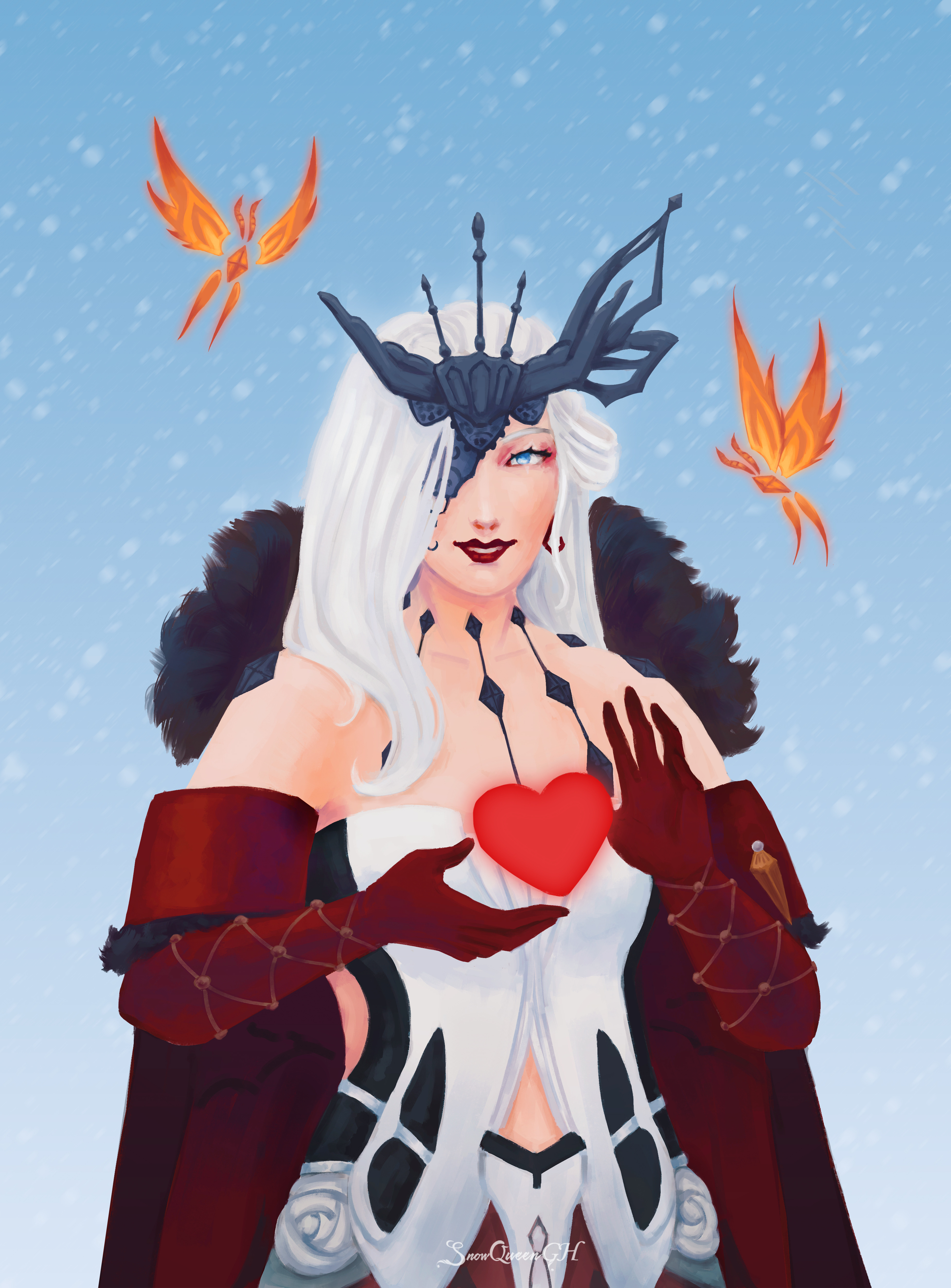 1girl 2others absurdres bare_shoulders black_gloves black_mask blonde_hair butterfly_mask crimson_lotus_moth_(genshin_impact) dress earrings elbow_gloves fishnet_gloves fishnets fur_trim genshin_impact gloves half_mask heart highres jewelry lace-trimmed_eyepatch long_hair looking_at_viewer mask mask_over_one_eye multiple_others one_eye_covered red_lips signora_(genshin_impact) single_earring sky smile snow snowqueen-gh studded_gloves