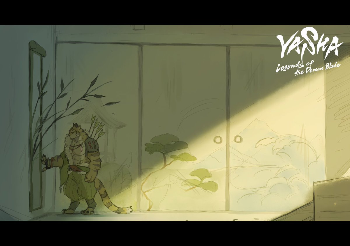 1boy abs animal_ears arrow_(projectile) artist_request bara claws commentary copyright_request english_commentary english_text furry furry_male japanese_clothes male_focus official_art pectorals tail taketora_(yasha) tiger_boy tiger_ears tiger_stripes tiger_tail yasha_legends_of_the_demon_blade yellow_fur