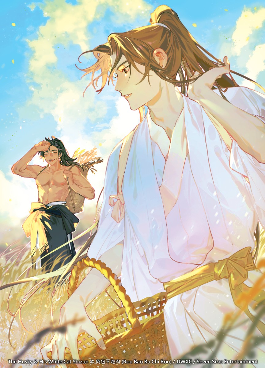 2boys backpack_basket bare_pectorals basket black_hair blue_sky blurry blurry_foreground brown_hair chinese_clothes chu_wanning closed_eyes cloud commentary cowboy_shot day depth_of_field english_commentary erha_he_ta_de_bai_mao_shizun hand_in_own_hair hand_on_own_head hanfu high_ponytail highres holding holding_basket long_hair long_sleeves looking_at_another male_focus mo_ran multiple_boys muscular muscular_male official_art open_mouth parted_lips pectorals ponytail rice rice_paddy sash sky smile standing suto_(sakumaaritsu) tasuki topless_male white_hanfu wide_sleeves