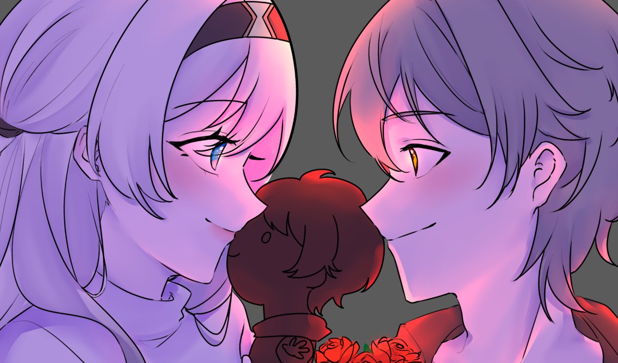 caelus_(honkai:_star_rail) chocolate_making closed_mouth firefly_(honkai:_star_rail) flower grey_hair hair_between_eyes hairband honkai:_star_rail honkai_(series) mindhew multicolored_eyes rose smile trailblazer_(honkai:_star_rail) yellow_eyes