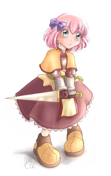 1girl bad_id bow brown_capelet brown_dress brown_shoes capelet chest_guard closed_mouth commentary dated_commentary dress english_commentary full_body green_eyes hair_bow holding holding_sword holding_weapon lola-art long_sleeves looking_at_viewer opencanvas_(medium) pink_hair purple_bow ragnarok_online shoes short_hair simple_background smile solo standing sword swordsman_(ragnarok_online) weapon white_background