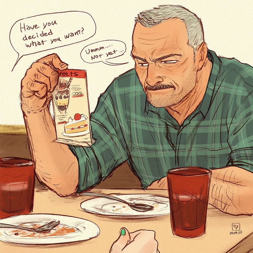aaron_gruber_(o_natsuo88) aqua_nails armor beard_stubble breastplate cup elbows_on_table facial_hair green_shirt holding holding_menu madison_(o_natsuo88) mature_male menu mustache o_natsuo88 original plaid_clothes plaid_shirt shirt short_hair simple_background speech_bubble spoon stubble table uncle_and_niece very_short_hair