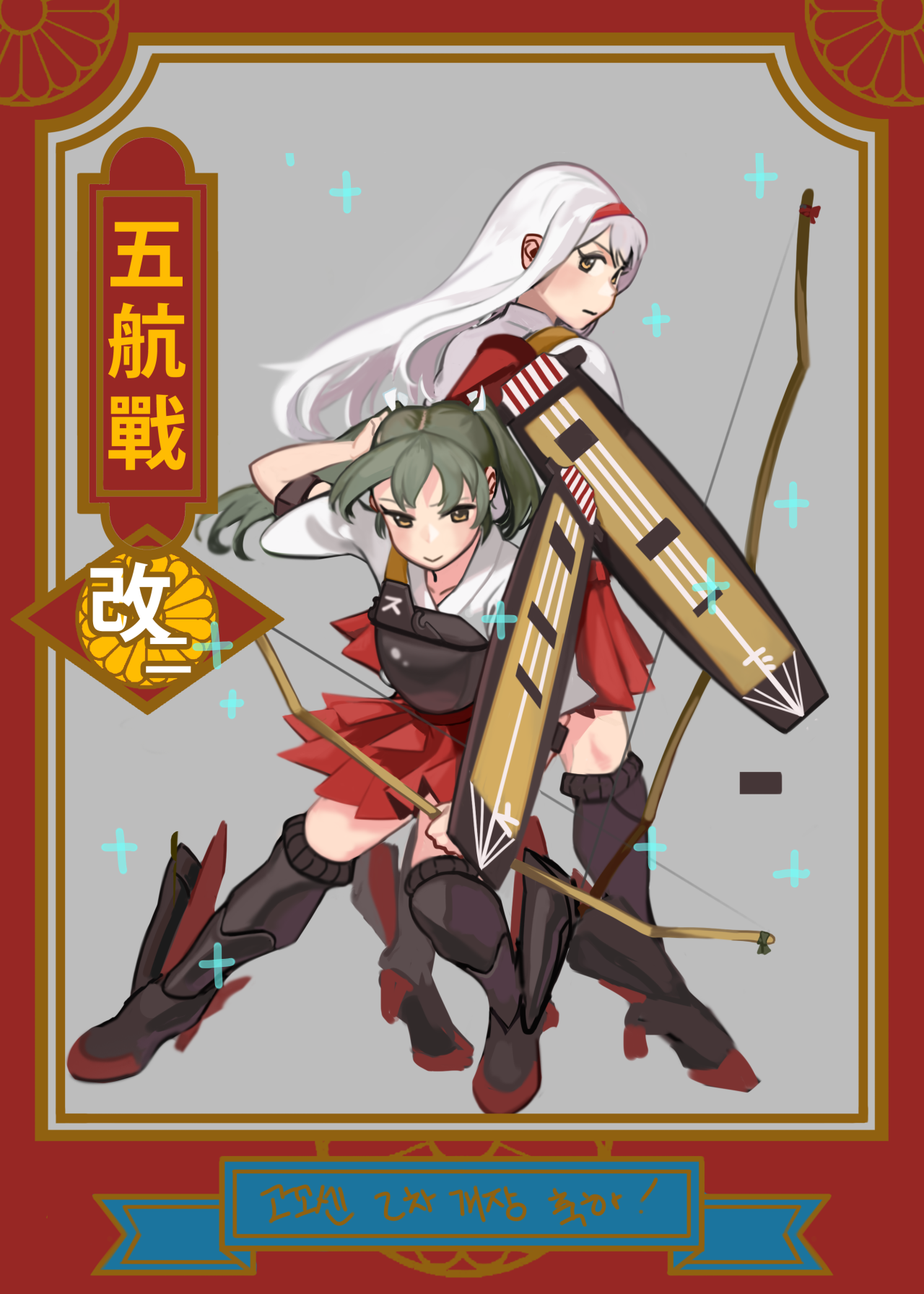 2girls arm_up boots bow_(weapon) closed_mouth flight_deck gom_(kooskoo) green_hair hair_ribbon hakama hakama_skirt highres holding holding_bow_(weapon) holding_weapon japanese_clothes kantai_collection long_hair multiple_girls muneate red_hakama ribbon rigging romaji_commentary rudder_footwear shoukaku_(kancolle) skirt standing thigh_boots twintails weapon white_hair white_ribbon zuikaku_(kancolle)