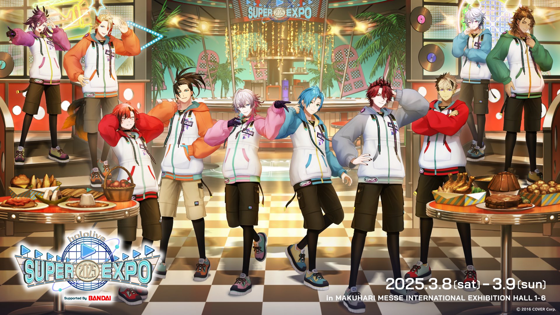 6+boys aqua_hair axel_syrios banzoin_hakka black_hair black_socks blonde_hair blue_eyes blue_hair brown_hair color-coded crimzon_ruze gavis_bettel goldbullet gradient_hair grey_hair hair_between_eyes heterochromia highres hololive_super_expo_2025_outfit holostars holostars_english hood hooded_jacket hoodie jacket josuiji_shinri jurard_t_rexford layered_sleeves long_sleeves machina_x_flayon male_focus multicolored_hair multiple_boys octavio official_art pink_eyes pink_hair purple_hair raglan_sleeves red_hair regis_altare shoes short_hair smile sneakers socks streaked_hair virtual_youtuber white_hair white_jacket
