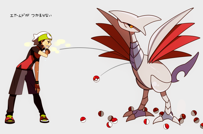 1boy black_leggings brendan_(pokemon) fingerless_gloves gen_2_pokemon gloves grimace hat himari_g_(sr) leggings male_focus nintendo poke_ball poke_ball_(basic) pokemon pokemon_(creature) pokemon_emerald pokemon_ruby/sapphire/emerald red_gloves red_shirt shirt short_hair skarmory sweat translated white_hat wiping_face