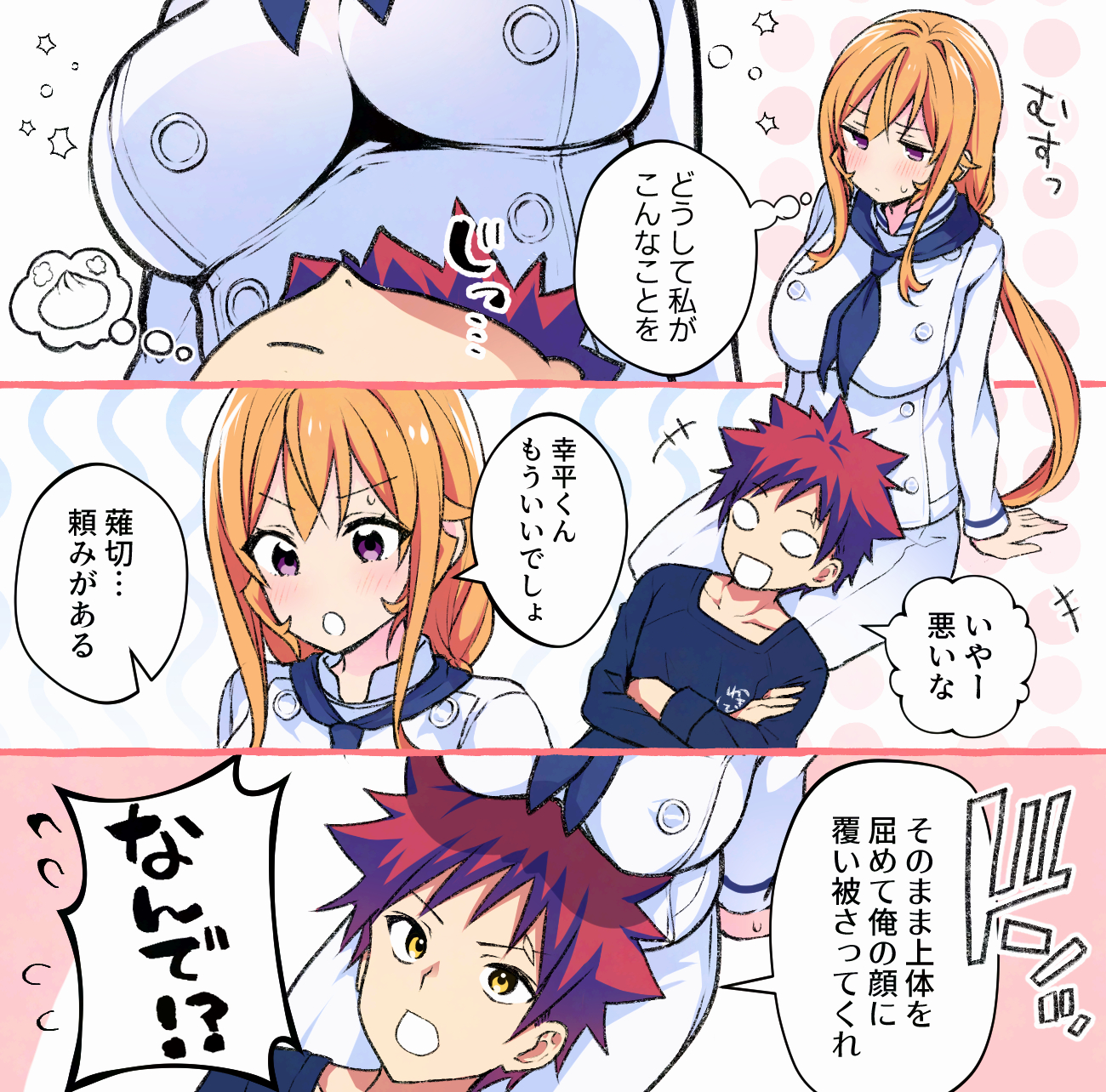 1boy 1girl :d :o blonde_hair blush breasts chef collarbone crossed_arms highres jacket large_breasts long_hair long_sleeves lying_on_lap nakiri_erina open_mouth outside_border red_hair shirt shokugeki_no_souma short_hair smile speech_bubble thought_bubble toy-black translation_request yukihira_souma