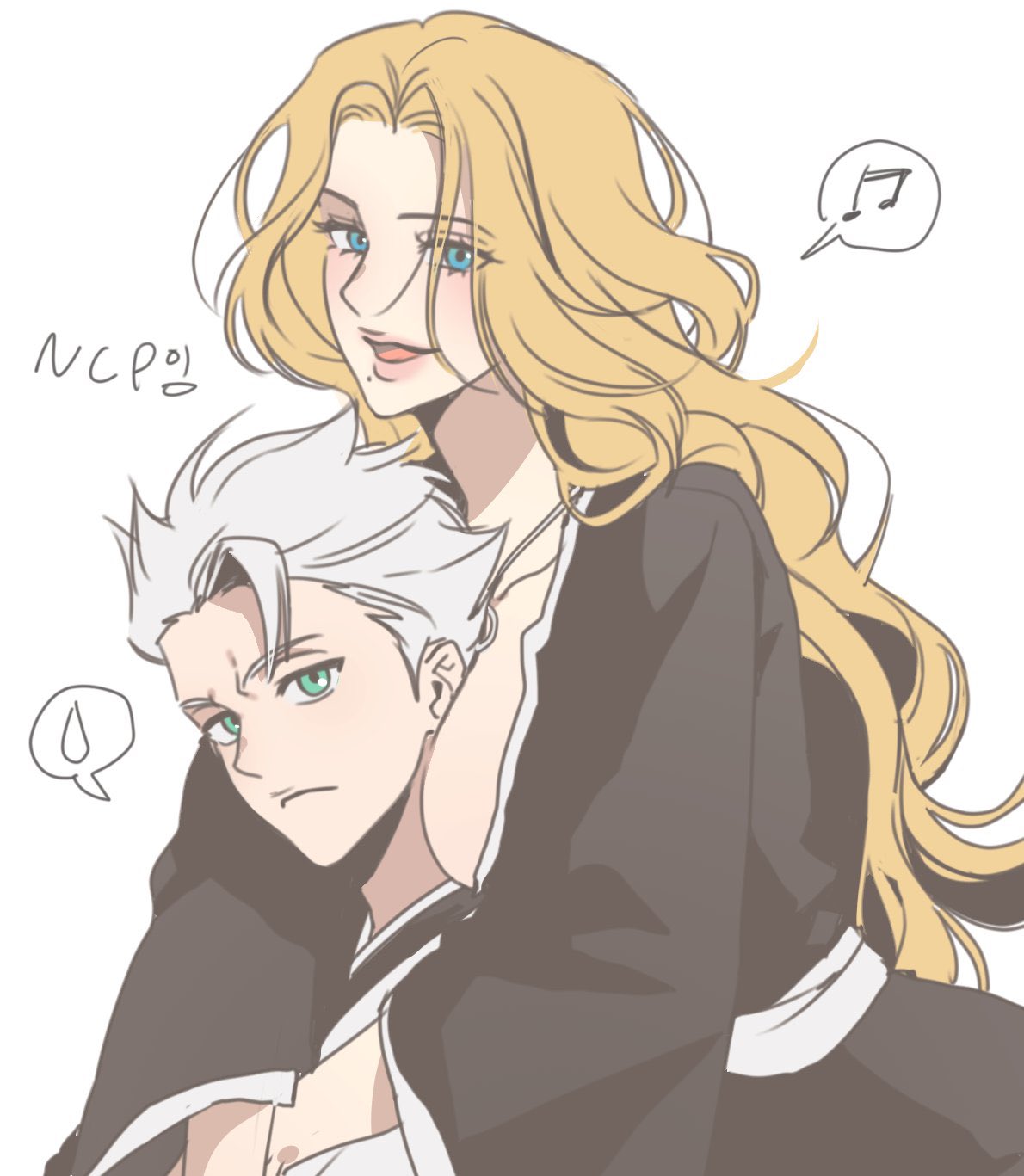 1boy 1girl bleach blonde_hair blue_eyes blush breast_rest breasts breasts_on_head cleavage green_eyes grey_hair highres hitsugaya_toushirou large_breasts long_hair looking_at_viewer matsumoto_rangiku parted_lips ppyobong11 shirt smile