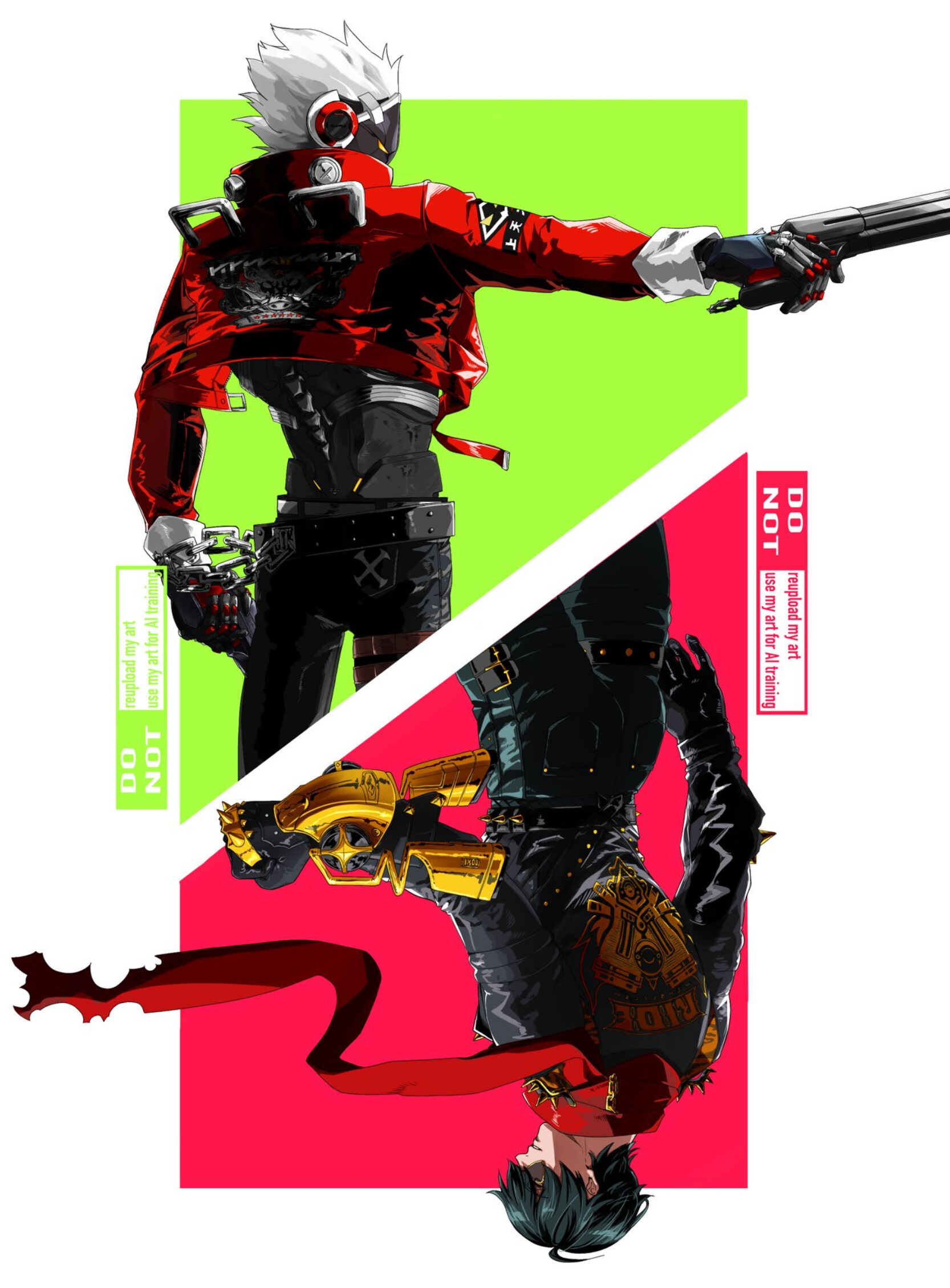 2boys ahoge belt wallet_chain billy_kid black_belt black_gloves black_jacket black_pants blue_pants chain clenched_hand cropped_jacket cyborg from_behind gloves green_background green_hair gun hair_between_eyes handgun highres holding holding_gun holding_weapon jacket leather leather_jacket lighter_(zenless_zone_zero) long_sleeves looking_to_the_side male_focus multiple_boys outstretched_arm pants parted_lips red_background red_jacket red_scarf sashimi_(sashimi_4_0) scarf short_hair shoulder_spikes spiked_hair spiked_jacket spikes standing studded_belt sunglasses thigh_strap torn_clothes torn_scarf upside-down v-shaped_eyebrows watermark weapon white_background white_hair yellow_eyes zenless_zone_zero