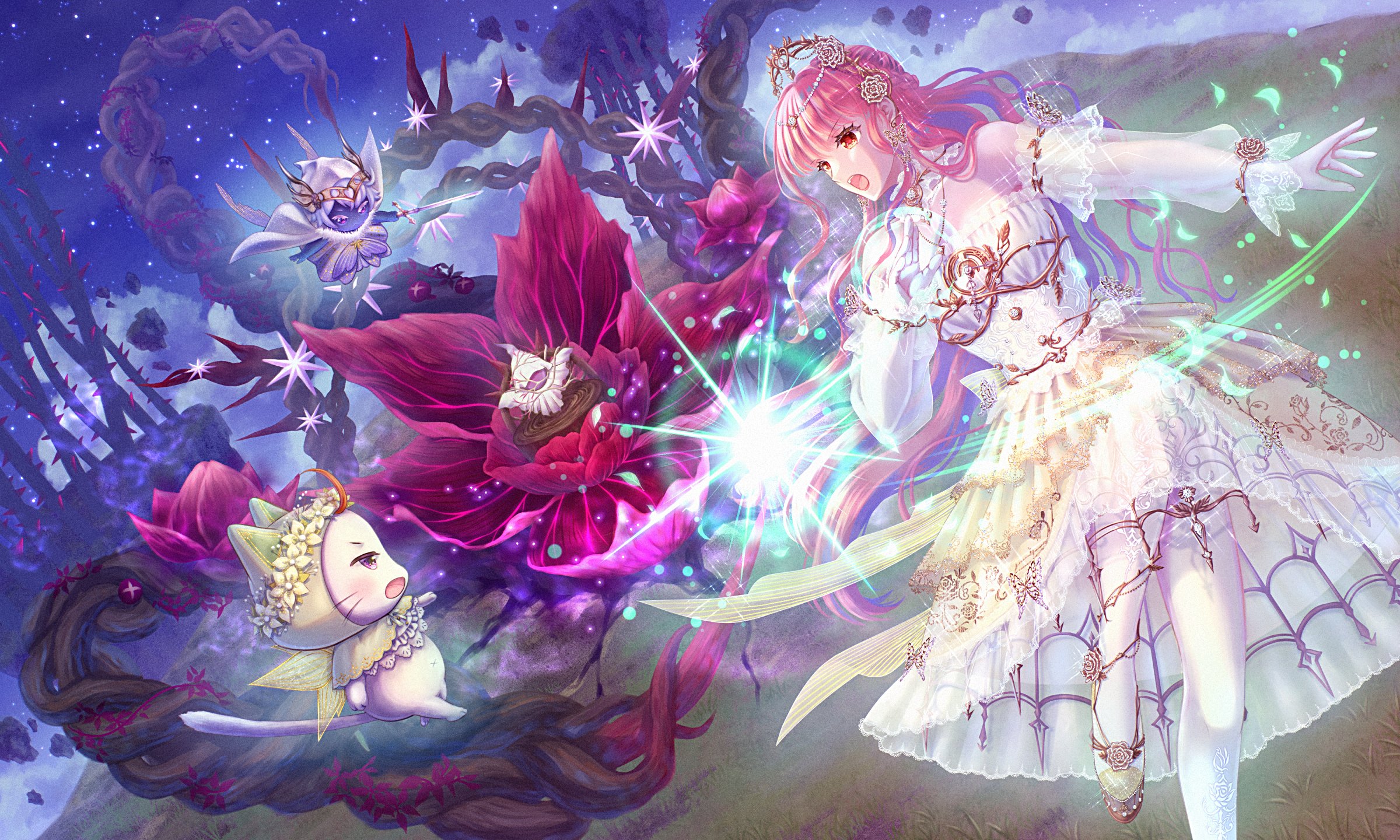 1girl ahoge animal arms_up bare_shoulders battle blunt_bangs bow bowtie brown_eyes cat chigda_(infinity_nikki) circlet cloak clothed_animal cloud commentary_request detached_sleeves determined dress dress_under_skirt ear_covers eyelashes faewish_sprite floating flower foot_out_of_frame frilled_dress frilled_sleeves frills giroda_(infinity_nikki) green_cloak hair_flower hair_ornament hand_up head_wreath highres holding holding_sword holding_weapon hood hood_up hooded_cloak infinity_nikki lace-trimmed_cloak long_hair long_sleeves looking_at_another magic medium_dress medium_skirt mizuki_ran momo_(nikki) night nikki_(nikki) nikki_(series) open_mouth outdoors pantyhose petals pink_flower pink_hair plant puffy_long_sleeves puffy_sleeves rose see-through_clothes see-through_sleeves shoes showgirl_skirt sidelocks skirt sky sleeves_past_fingers sleeves_past_wrists sparkle spoilers star_(sky) starry_sky strapless strapless_dress sword teeth thorns upper_teeth_only very_long_hair vines visor_(armor) wavy_hair weapon whiskers white_bow white_bowtie white_cat white_cloak white_dress white_pantyhose white_sleeves wishful_aurosa_(infinity_nikki) yellow_flower yellow_rose yellow_shoes yellow_skirt