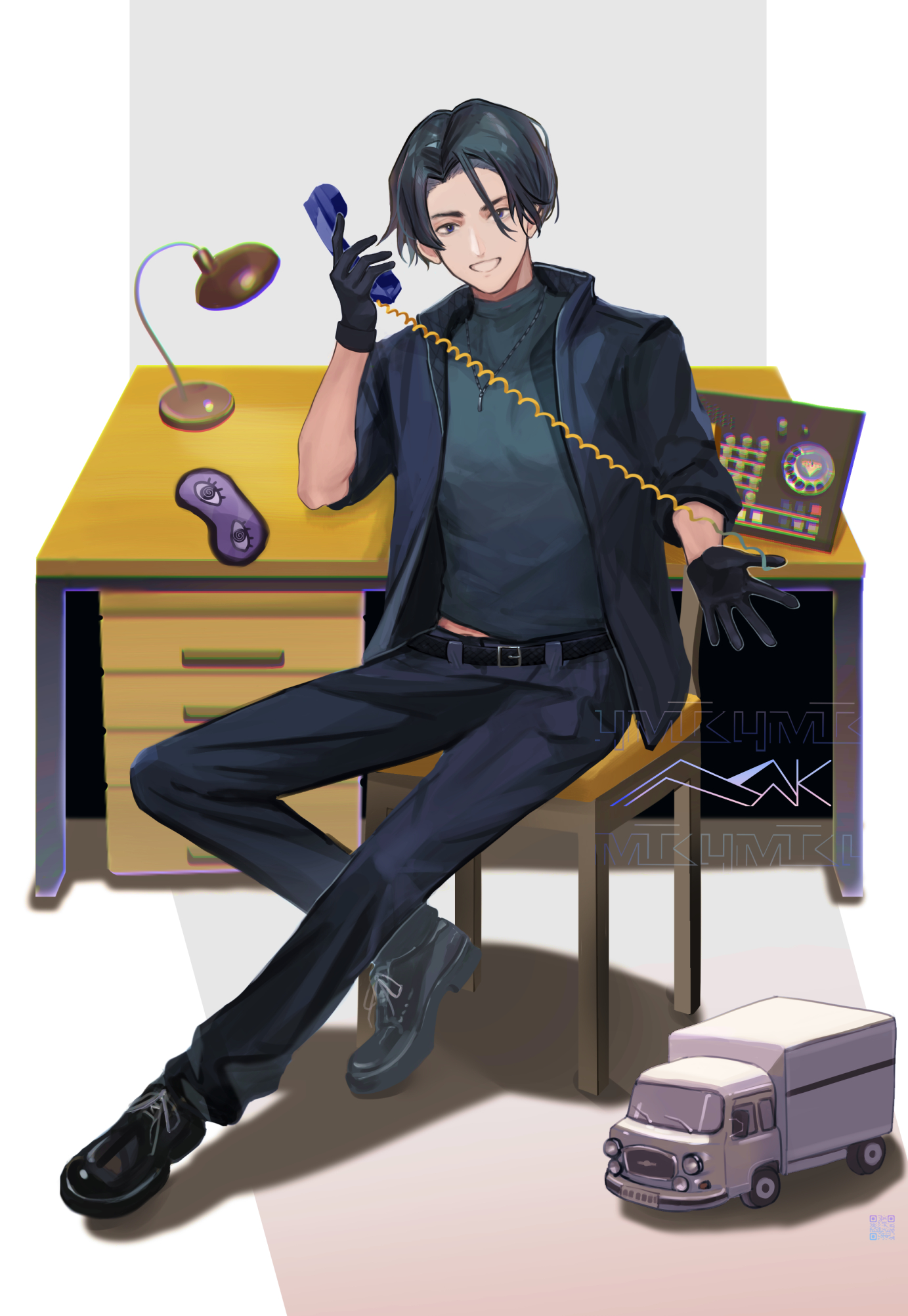 1boy belt black_belt black_eyes black_gloves black_hair blue_jacket blue_pants cellphone chair commentary english_commentary eye_mask full_body girls'_frontline gloves green_shirt highres holding holding_phone j_(girls'_frontline) jacket jewelry lamp looking_at_viewer mask necklace open_mouth pants phone shirt short_hair short_sleeves simple_background sitting smile solo table yotsuyama_(yomo8ama)