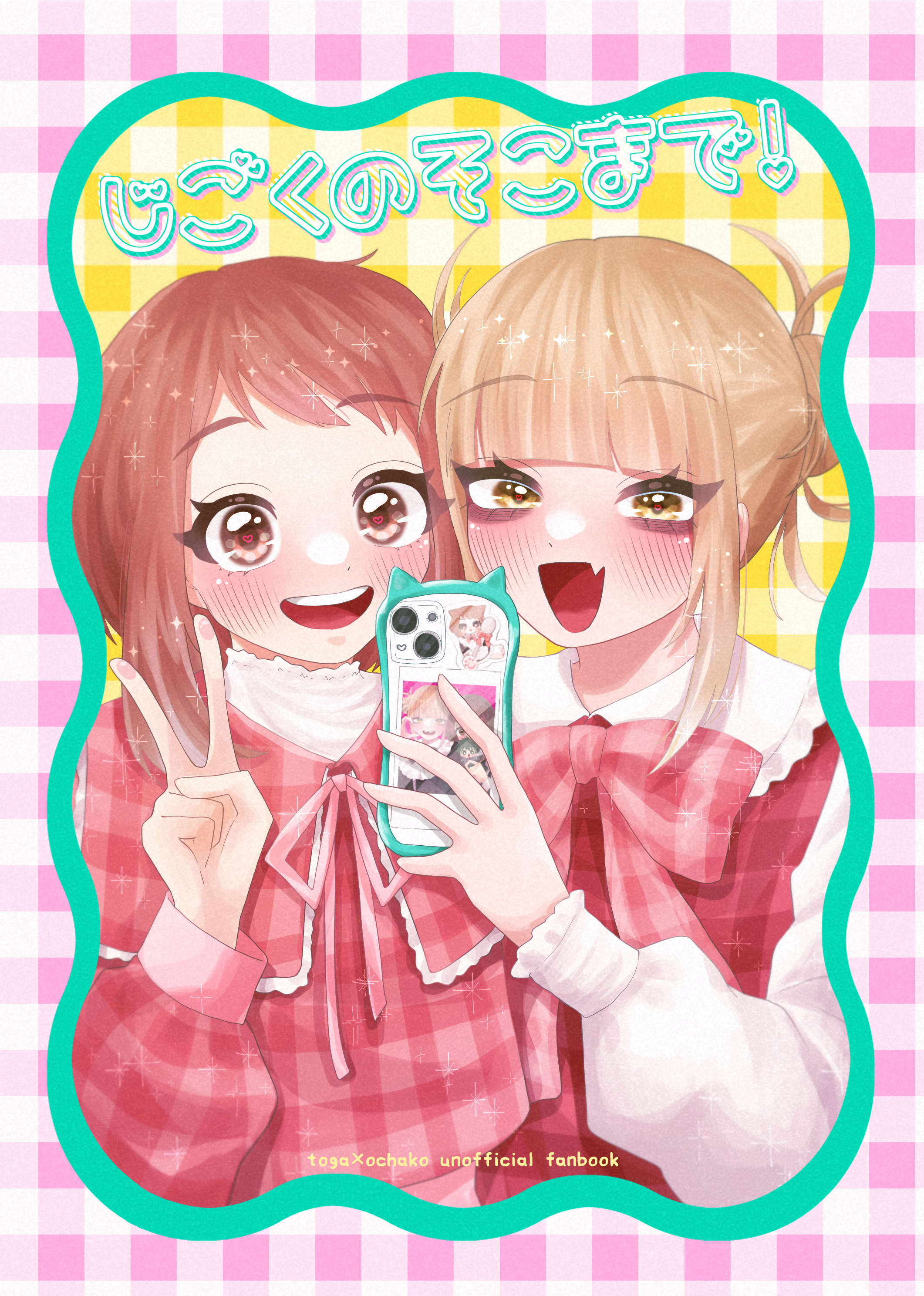 2girls absurdres amecho_wa blush boku_no_hero_academia bow cellphone dress highres iphone looking_at_viewer multiple_girls open_mouth outline phone plaid_background plaid_clothes short_hair smartphone smile toga_himiko uraraka_ochako v