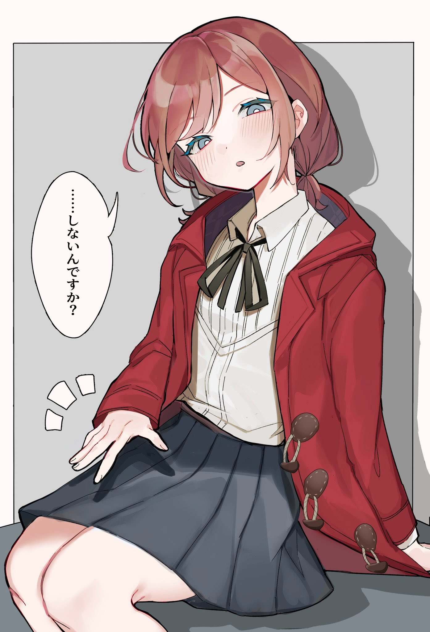 1girl black_ribbon black_skirt blue_eyes blush border collared_shirt commentary_request girls_band_cry grey_background highres iseri_nina jacket lap_pillow_invitation looking_at_viewer na_(niruo3) neck_ribbon open_clothes open_jacket parted_lips pleated_skirt red_hair red_jacket ribbon shadow shirt short_twintails simple_background sitting skirt solo speech_bubble translation_request twintails white_border white_shirt