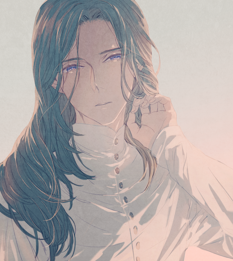 1boy dress_shirt fire_emblem fire_emblem:_three_houses green_eyes green_hair hair_over_shoulder hand_up head_tilt linhardt_von_hevring linhardt_von_hevring_(timeskip) long_hair long_sleeves male_focus nintendo ori_(o_r_iii) parted_bangs parted_lips shirt simple_background solo tucking_hair upper_body white_background white_shirt