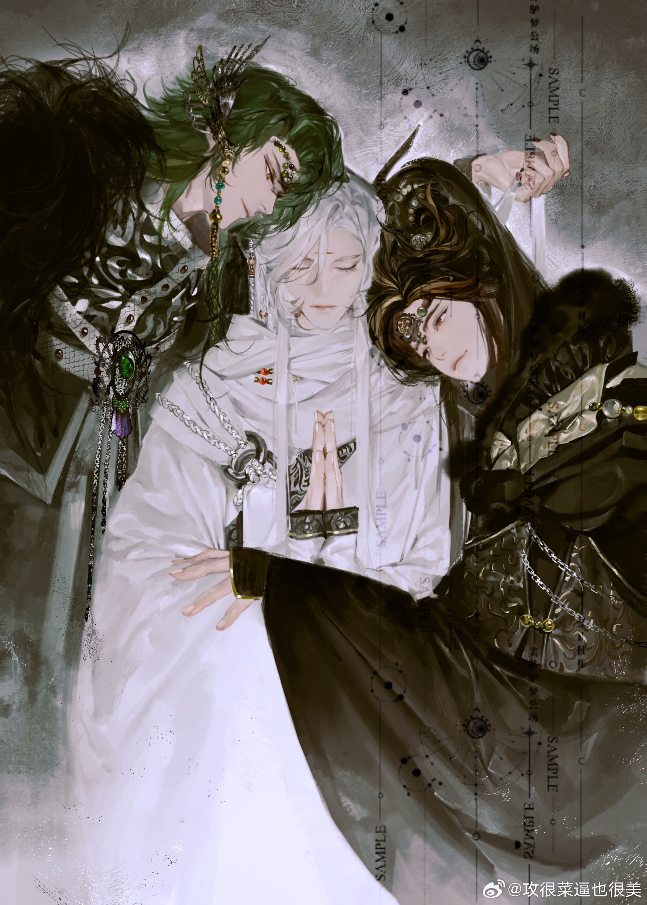 3boys absurdres beads black_hair black_hanfu black_sleeves brown_eyes brown_hair chain character_request chinese_clothes circlet closed_eyes closed_mouth curtained_hair earrings facial_mark from_side fur_trim gong_hencai_bi_ye_henmei green_hair hair_beads hair_ornament hand_on_another's_arm hanfu head_on_another's_shoulder highres huadian jewelry jinguang_budaixi long_hair long_sidelocks long_sleeves looking_at_another lushi_moluo male_focus multicolored_hair multiple_boys own_hands_together parted_bangs praying qiao_rulai sample_watermark sidelocks sleeves_past_wrists straight-on tassel upper_body watermark white_hair white_hanfu white_sleeves xiao_guan_(headdress) yellow_eyes