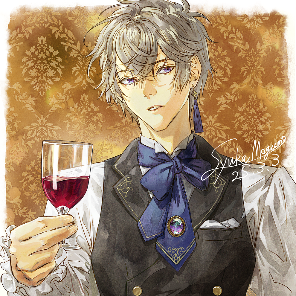 1boy alcohol black_vest blue_scarf brooch brown_background cup dated drinking_glass earrings grey_hair holding holding_cup jewelry long_sleeves looking_at_viewer male_focus original panmijin99 parted_lips purple_eyes red_wine scarf shirt short_hair signature single_earring solo tassel tassel_earrings upper_body vest white_shirt wine wine_glass