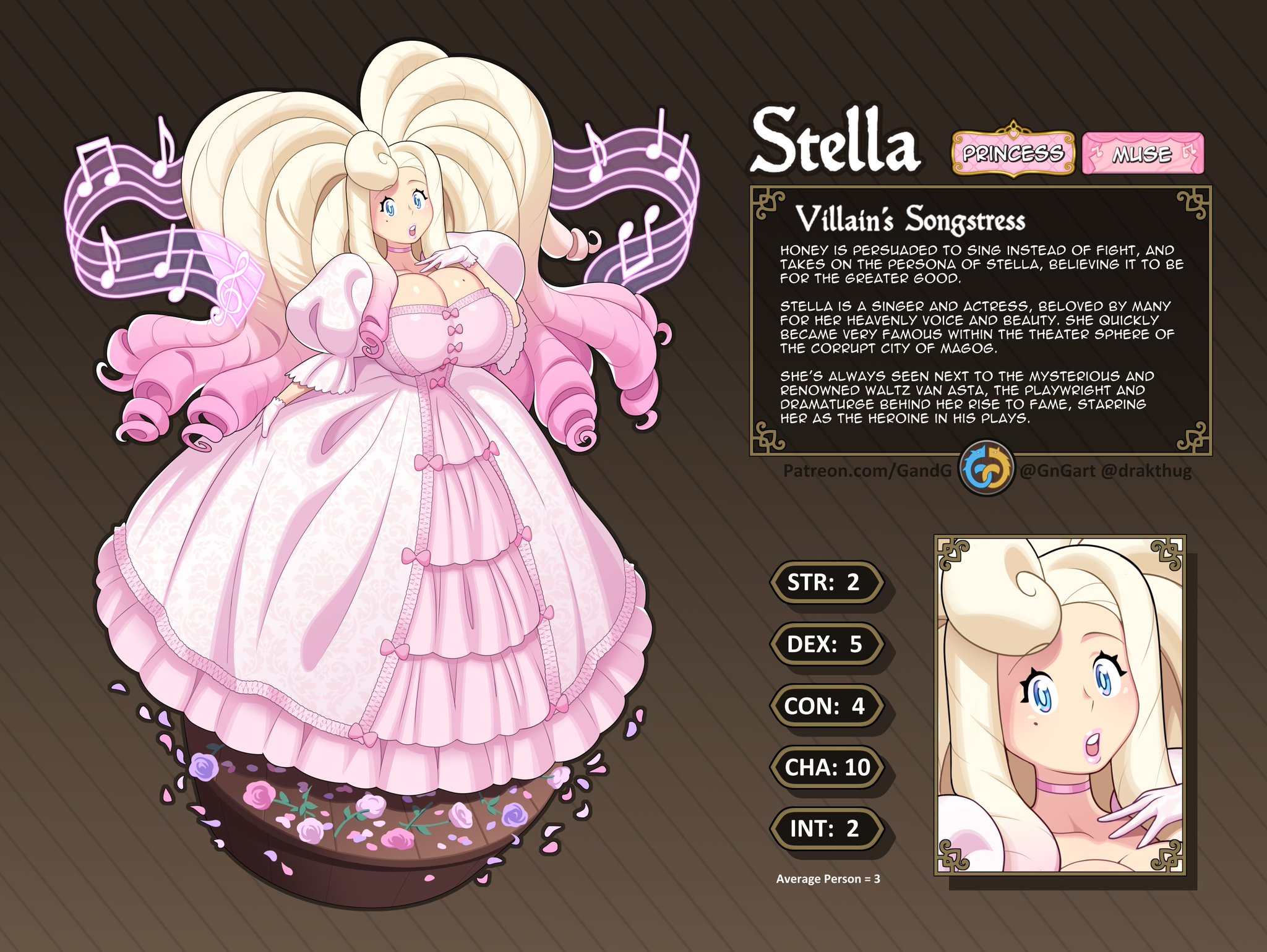 1girl aristocratic_clothes blonde_hair blue_eyes breasts curvy gandg glitter_and_gold highres honey_luxmoore_(gandg) musical_note original pink_lips princess reference_sheet thick_lips twintails