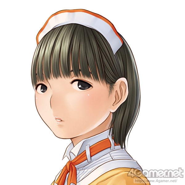 1girl black_eyes black_hair bow bowtie headscarf looking_at_viewer love_plus official_art orange_bow orange_bowtie otori_nodoka parted_lips pink_lips portrait shirt short_hair simple_background solo tareme turtleneck waitress watermark web_address white_background