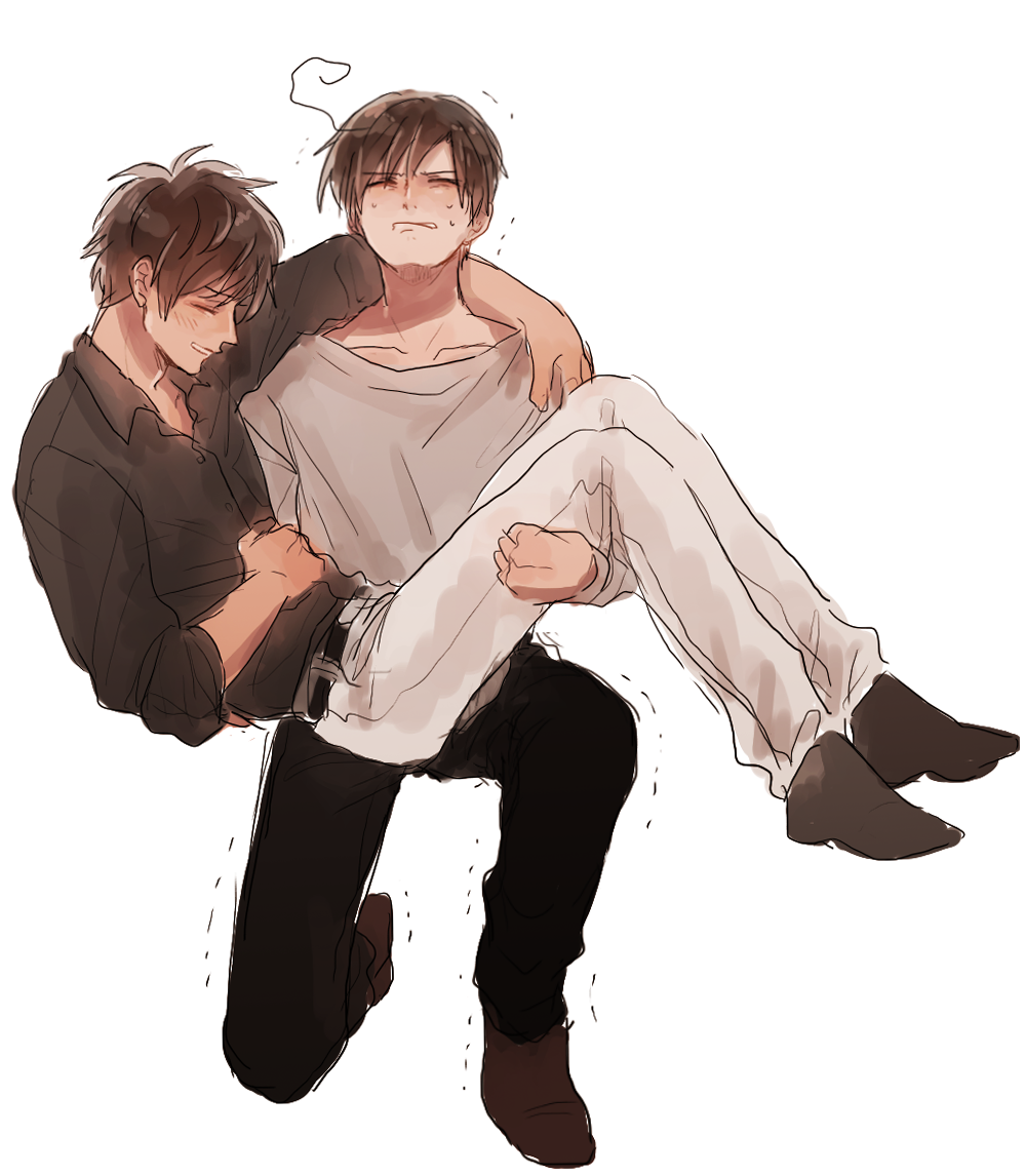 2boys ahoge axis_powers_hetalia black_pants black_shirt blush brown_hair brown_shoes buttons carrying closed_eyes collarbone collared_shirt commentary_request full_body grey_shirt hand_on_own_stomach long_sleeves male_focus multiple_boys on_one_knee pants princess_carry shirt shoes short_hair simple_background smile southern_italy_(hetalia) spain_(hetalia) sweat tan teeth trembling white_background yaoi zy_(dondokodo-mu)