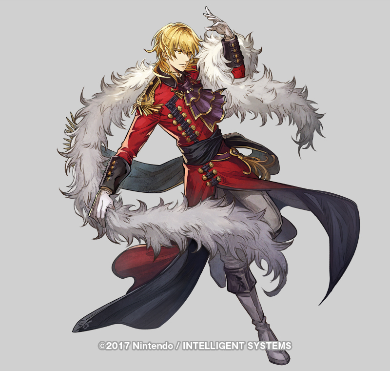 1boy alternate_costume blonde_hair boots copyright_notice dancing eldigan_(fire_emblem) eldigan_(masquerade)_(fire_emblem) epaulettes feather_boa fire_emblem fire_emblem:_genealogy_of_the_holy_war fire_emblem_heroes full_body fur_trim gloves grey_background male_focus medium_hair nijihayashi nintendo official_art solo yellow_eyes