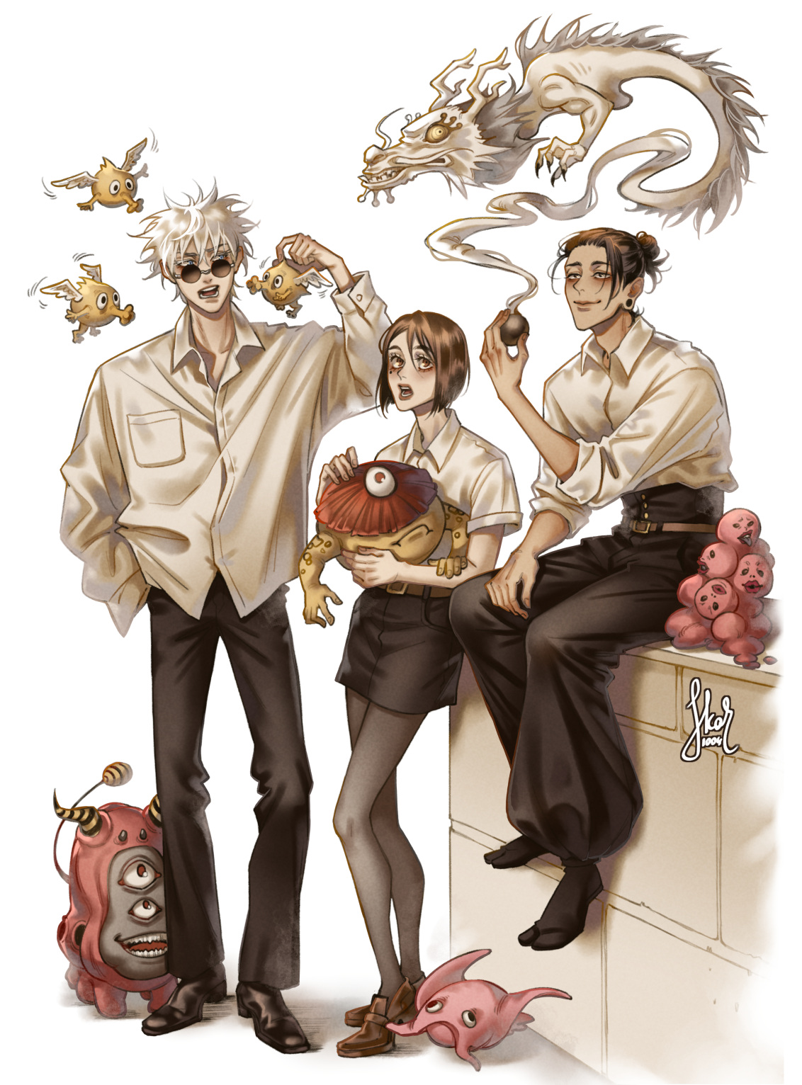 1girl black_hair black_pants bob_cut brown_hair carrying commentary creature cursed_spirit_(jujutsu_kaisen) dragon ear_piercing english_commentary full_body geto_suguru gojo_satoru hair_bun hand_in_pocket high-waist_pants highres ieiri_shoko jewelry jujutsu_kaisen looking_at_another mole mole_under_eye pants piercing round_eyewear school_uniform shirt signature simple_background single_sidelock sitting skar_1004 smile white_shirt wings
