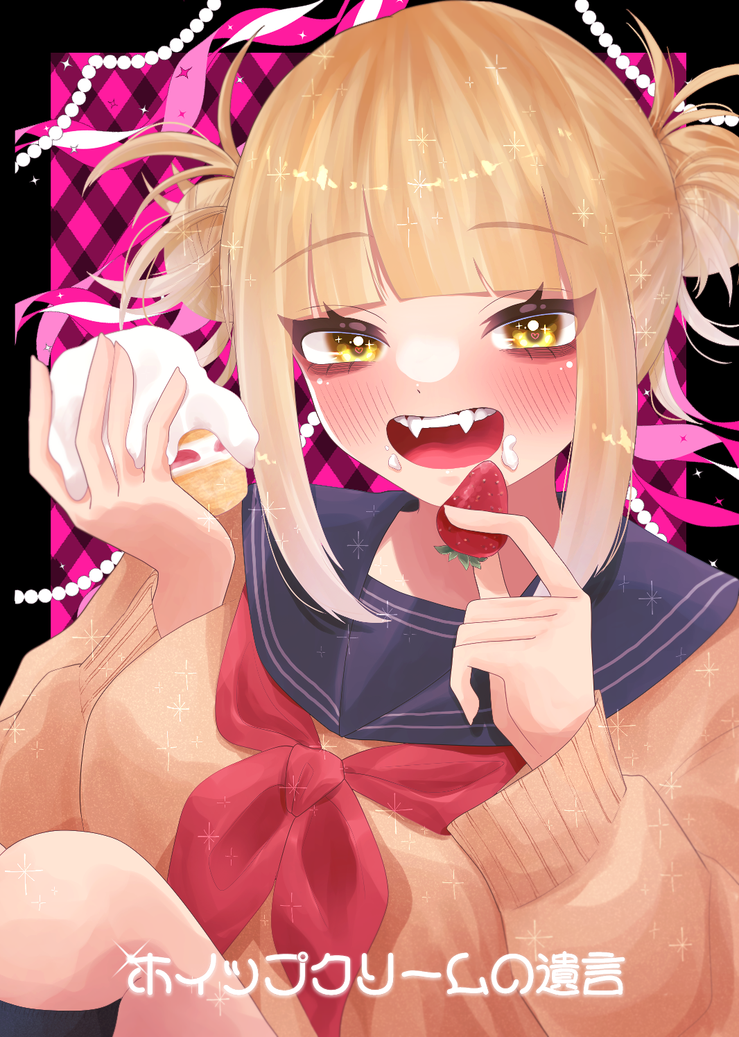 1girl amecho_wa black_outline blonde_hair blunt_bangs blush boku_no_hero_academia breasts cardigan double_bun fangs food fruit hair_bun highres long_sleeves looking_at_viewer messy_hair neckerchief open_mouth outline pancake plaid_background red_neckerchief sailor_collar school_uniform serafuku short_hair sidelocks simple_background sitting smile solo strawberry teeth toga_himiko yellow_cardigan yellow_eyes