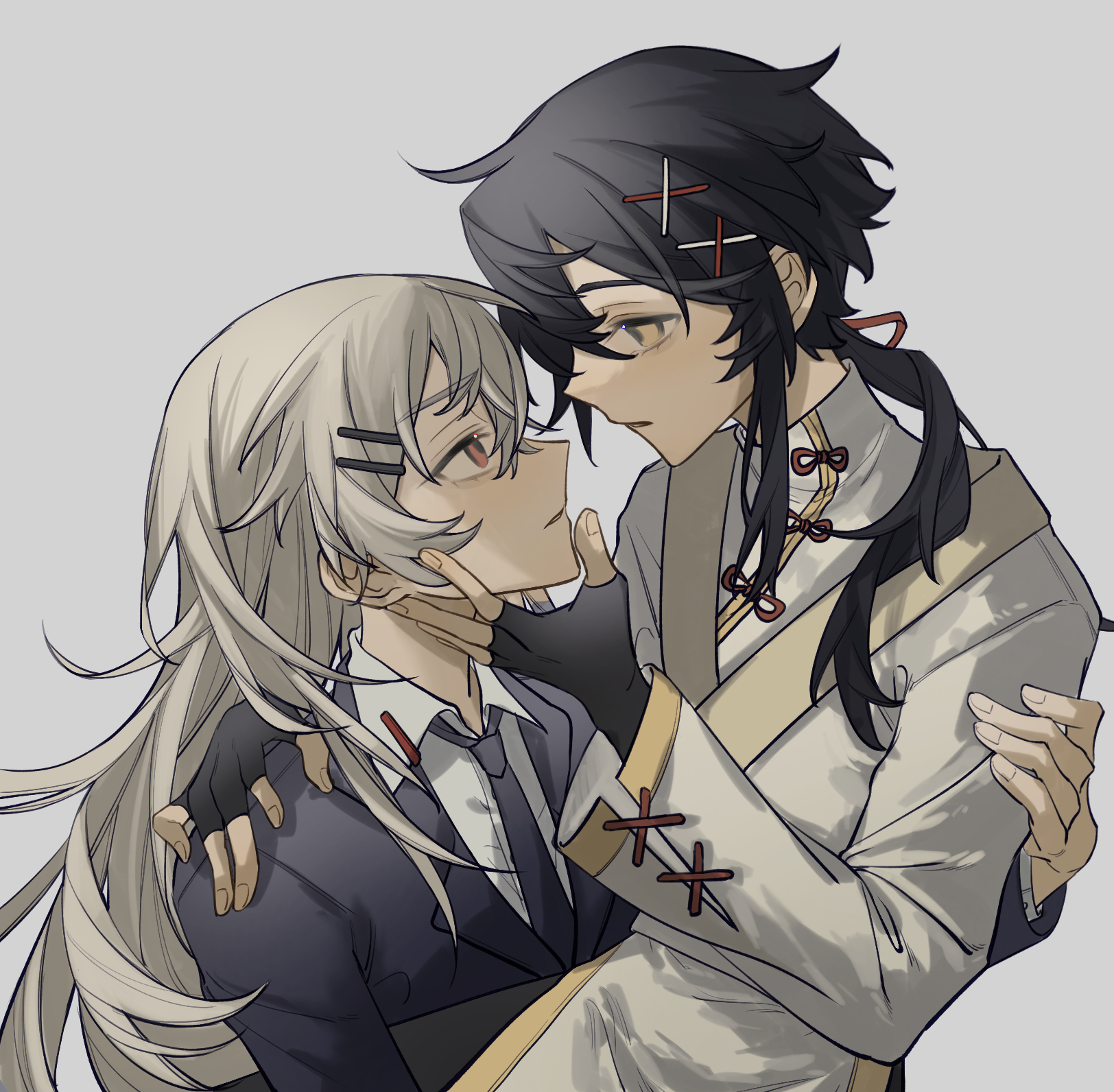 2boys black_gloves black_hair black_jacket black_necktie carrying carrying_person chinese_clothes chinese_commentary collared_shirt commentary_request dianbo635 fingerless_gloves gloves grey_background grey_hair hair_ornament hairclip hand_on_another's_arm hand_on_another's_cheek hand_on_another's_face hand_on_another's_shoulder hanfu highres jacket kensei_(streamer) lapels long_hair male_focus multiple_boys necktie notched_lapels ponytail procreate_(medium) real_life red_eyes shirt simple_background weiyunsi white_hanfu white_shirt x_hair_ornament yaoi