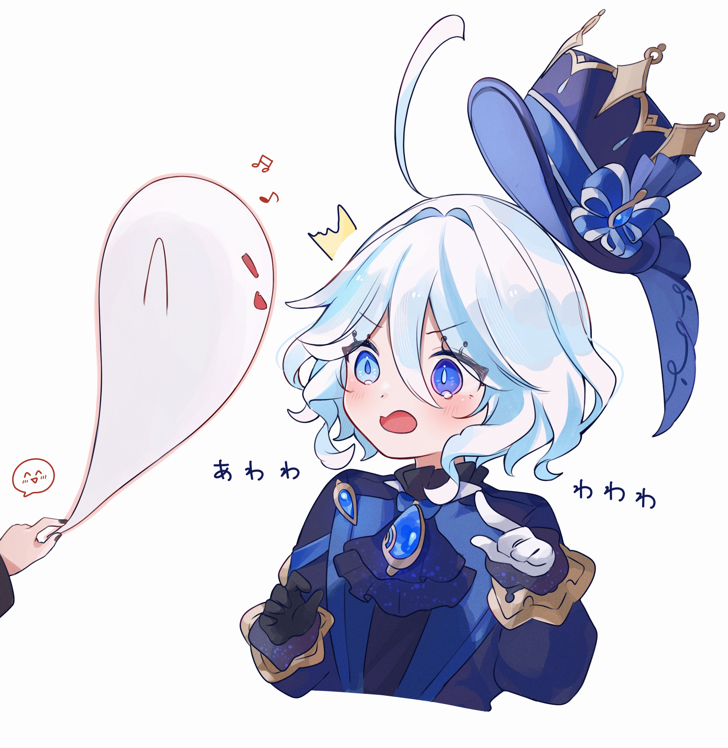 1other 2girls absurdres ahoge black_gloves black_nails blue_bow blue_eyes blue_hair blue_hat blue_jacket blush boo_tao_(genshin_impact) bow drop-shaped_pupils engasaki_sakura furina_(genshin_impact) genshin_impact ghost gloves hair_between_eyes hat hat_bow heterochromia highres hu_tao_(genshin_impact) jacket jewelry long_sleeves medium_hair mismatched_pupils multicolored_hair multiple_girls open_mouth streaked_hair symbol-shaped_pupils tears top_hat white_background white_gloves white_hair